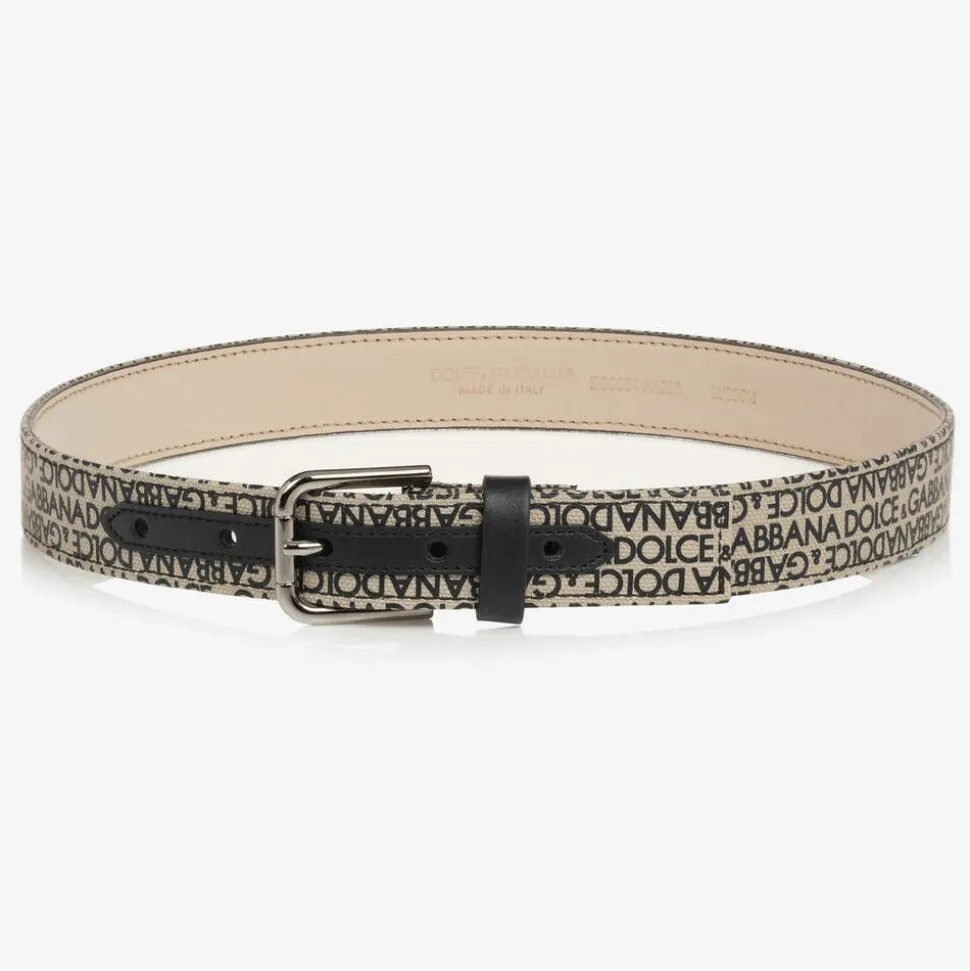 Light beige canvas belt for boys by luxury designer Dolce & Gabbana, detailed with black leather trims. Instantly recognisable, this Italian-made accessory is woven with cotton fabric and printed with black logo lettering for distinctive style. It has an adjustable pin buckle in silver hardware and a black belt loop stop.