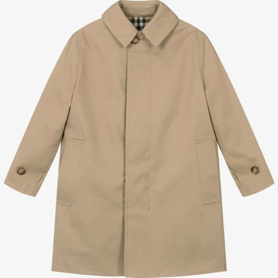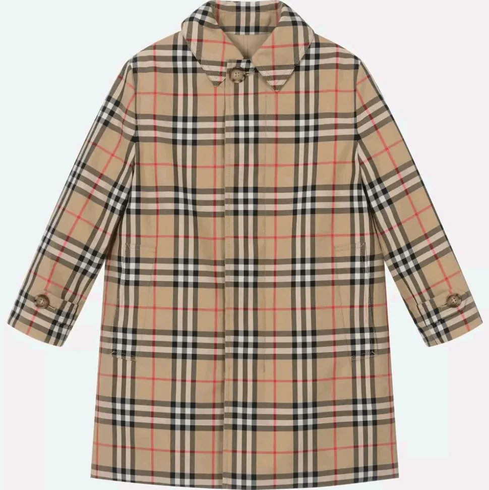 In the brand's signature archive beige, this reversible car coat for boys is by luxury British fashion house Burberry. One side features the designer's distinctive Vintage check pattern in beige, black and red, while the other is plain beige. Both sides have pockets and are trimmed with tortoiseshell effect buttons on the cuffs and beneath the front placket. Woven in shower resistant cotton gabardine, this stylish coat has a pointed collar, with a vented back for ease of movement.