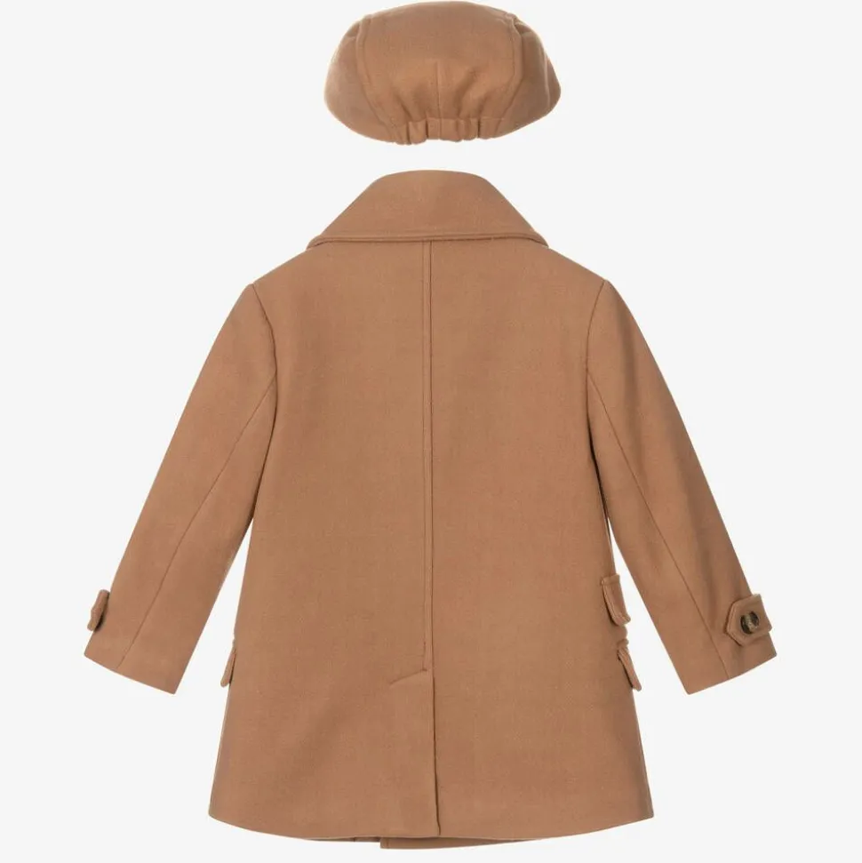 Dark beige coat and cap set for boys by Beau KiD. Super soft and comfortable to wear, it has a smart collar and double-breasted button closures on the front for a timeless silhouette. To lock in warmth, it has an interior zip fastening with super soft velour trims for extra comfort. There are useful front flap pockets and classic button detailing on the cuffs. It comes with a matching flat cap with a small stiff brim in the front to complete a traditional look.