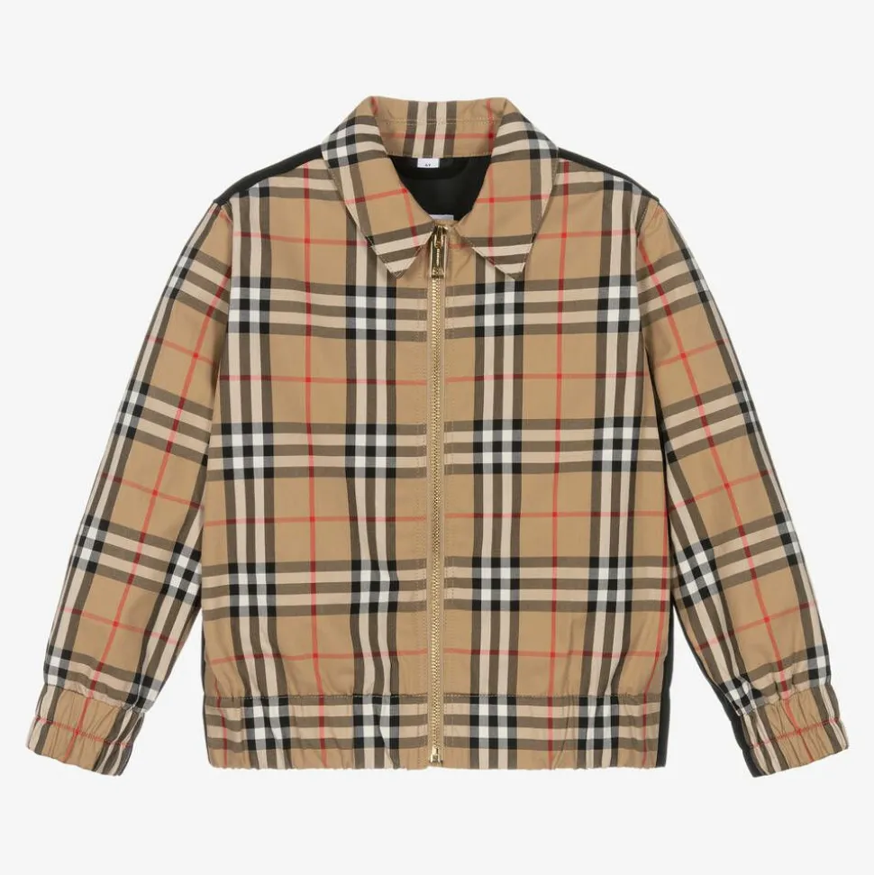 Eye-catching beige cotton jacket for boys by British brand Burberry, patterned with the designer's archival Vintage Check on the front and sleeves. Made in comfortable twill, it has black panels and elbow patches on the sleeves, and a matching back. The jacket has an exposed, golden zip fastening with a logo pull tab and useful, concealed side pockets that are secured with poppers. The hemline and cuffs are elasticated for extra cosiness and a neat fit. It is lined in soft black satin for comfort.