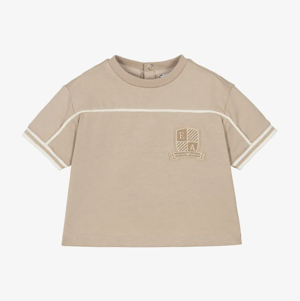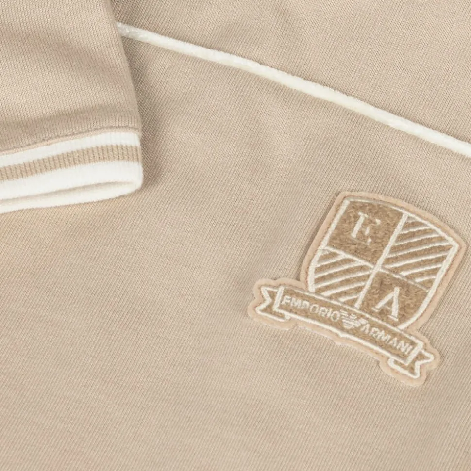 A beige T-shirt for younger boys by Italian label Emporio Armani, made in soft cotton jersey. With a cool varsity-inspired look, this short-sleeved tee has a distinctive, beige, branded crest appliqué on the front. There is ivory velvet piping across the chest and ivory tipping on the ribbed cuffs. To make dressing easier, there are logo-embossed poppers on the back.