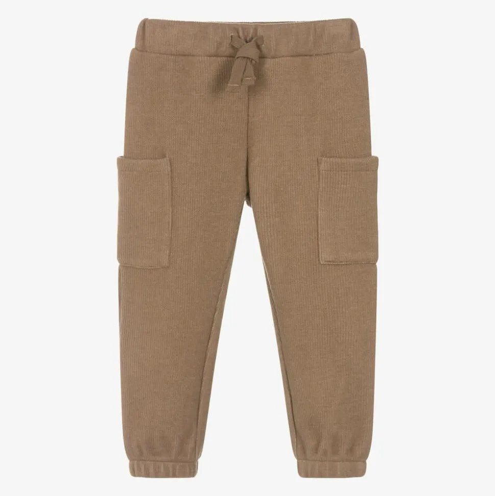 Dark beige cuffed trousers for boys by Everything Must Change, made from soft and stretchy knitted jersey. Ideal for comfortable casual wear, they have patch pockets on both legs and a gently elasticated waistband with an adjustable drawstring tie.
