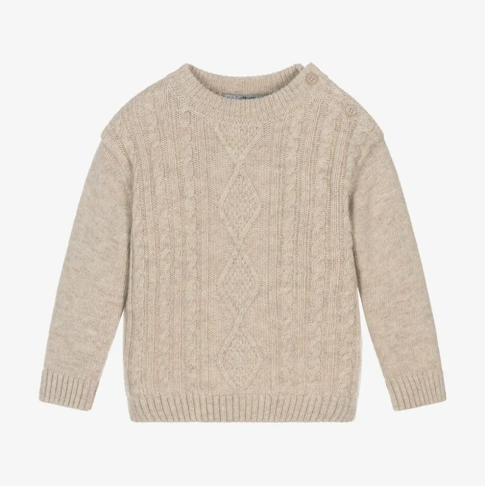 Beige sweater for younger boys by Portuguese brand Dr. Kid, knitted in a soft, warm blend of wool and cotton. With a charming diamond and cable knit design, this cosy top has lightly ribbed trims and a casual crew neckline. There are button fastenings on smaller sizes, allowing it to slip on easily.