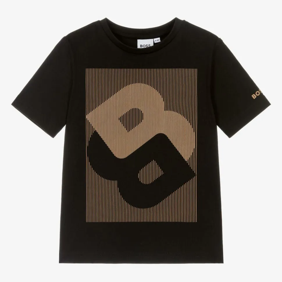 Black cotton T-shirt for boys by BOSS, made in comfortable jersey for casual dressing. Bold and branded, this short-sleeved tee features a striped Double B monogram on the front and a small logo print on one arm.