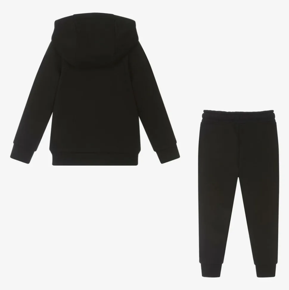 Black tracksuit for boys by BOSS, made in soft, mid-weight cotton jersey with a warm, fleecy inside. Both pieces feature a vertical white logo print on the front for instant brand recognition. The zip-up hooded top has side seam pockets and a useful chin guard at the top of the zip. The joggers also have side seam pockets and have a drawstring waist for a comfortable fit.