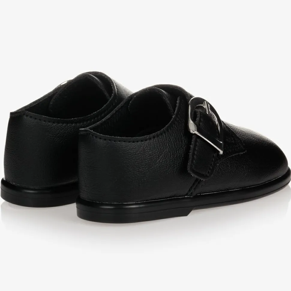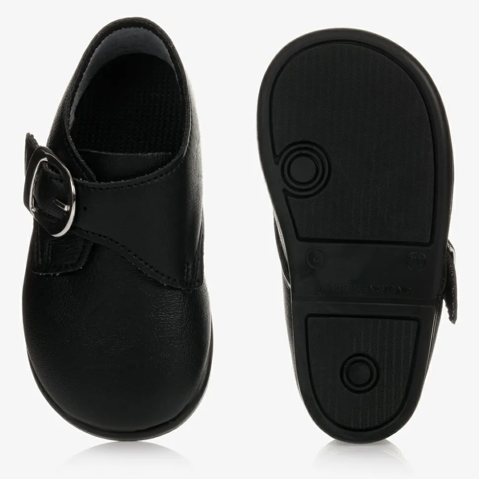 Black first-walker shoes for little boys by Early Days, made in soft faux leather.  They have an absorbent lining, padded insoles and a flexible sole.