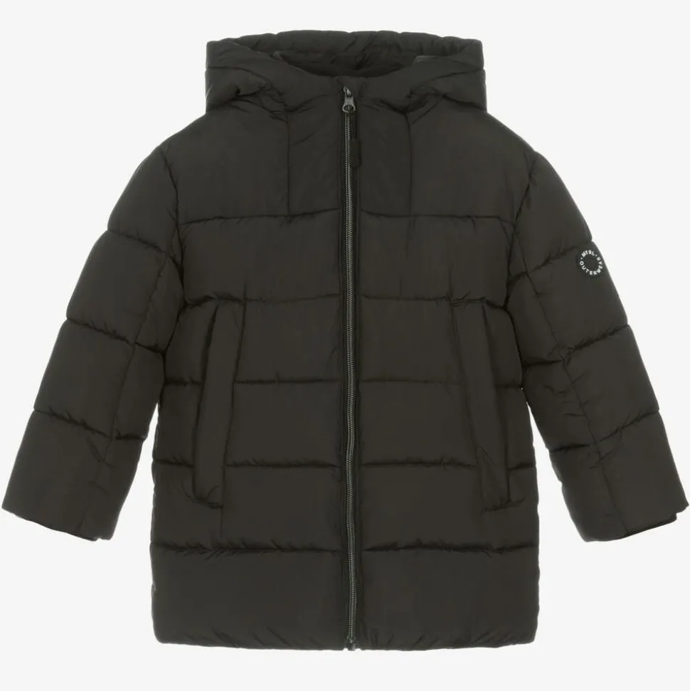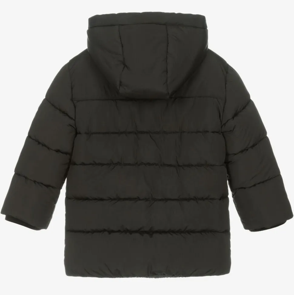 Matte black hooded puffer coat for boys by Mayoral. It is made in silky-smooth fabric, with useful zip-up pockets on the front for warming hands or storing essentials. Comfortable and cosy, it is lined with polar fleece, padded with medium-weight insulation and designed with an elasticated hem. The brand's black and white circular logo is stitched on one sleeve to complete the monochrome look.