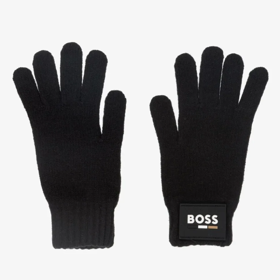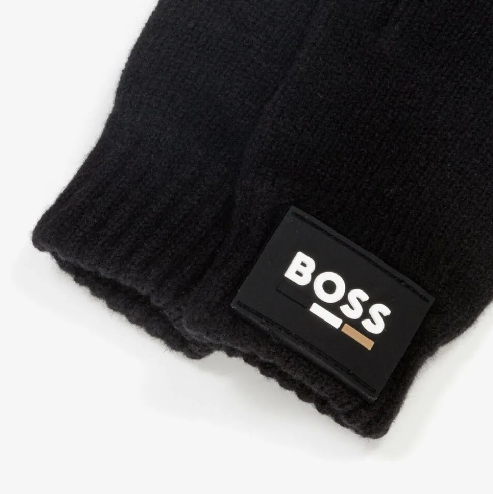 Black gloves for boys by BOSS, knitted in a soft cotton and wool blend. Ideal for providing lightweight warmth, these stretchy gloves have comfortable ribbed cuffs. For unmistakable designer appeal, one glove has a rubberised logo patch on the wrist.