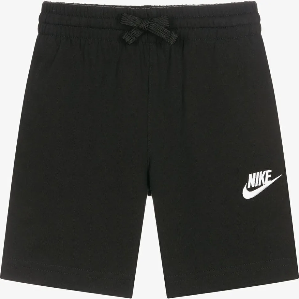 Boys black cotton jersey shorts by sports brand, Nike. They have an adjustable drawstring waist and the brand's logo is embroidered in white on one leg. There are pockets at the sides and one on the back.