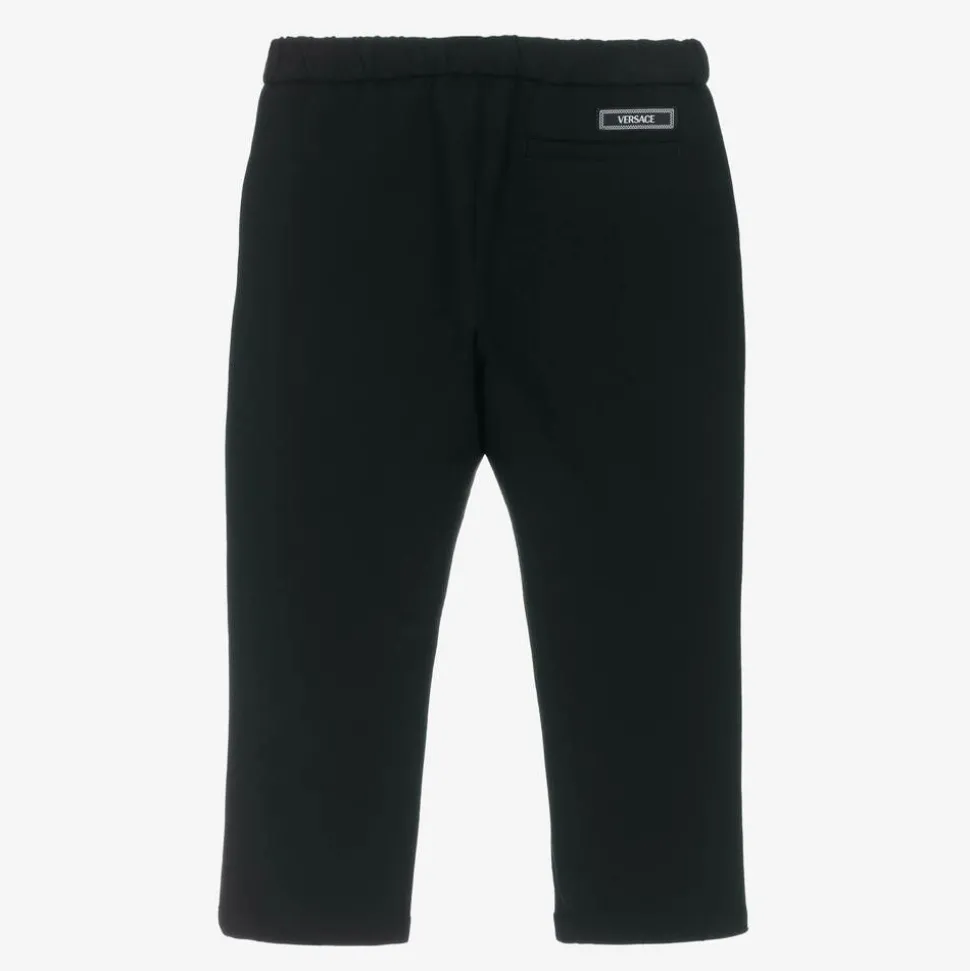 Both stylish and comfortable for younger boys, these black trousers by luxury label Versace, are made in soft Milano jersey. This smart design has slanted front pockets, a welt back pocket and a stretchy elasticated waistband. The Italian brand's distinctive logo patch can be seen on the back for instant designer appeal.
