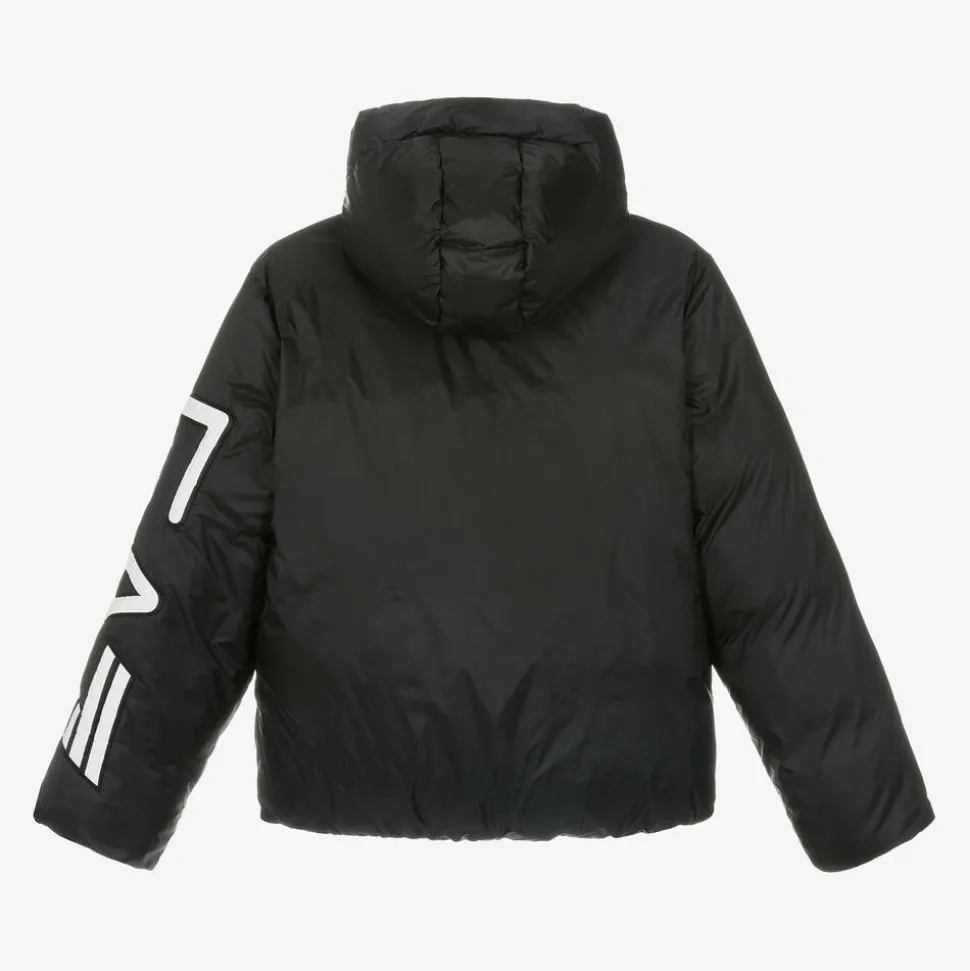 A black puffer jacket for boys by EA7 Emporio Armani, made and lined in silky fabric. The brand's EA7 logo patch is stitched on the front and a stand-out graphic is printed on one sleeve in white, adding those signature designer elements. This hooded jacket fastens with branded zips on the front and pockets. Mid-weight padding and fleece-lined pockets offer warmth and comfort.