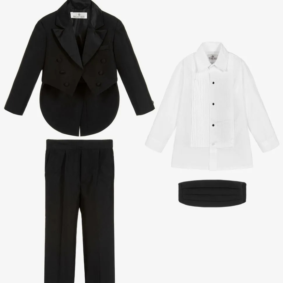 Boys black tuxedo suit by Beau KiD. The tail jacket and trousers are made in a lightweight twill, with satin trim to match the cummerbund and bow tie. The jacket is designed not to fasten and the trousers have an elasticated waist. It comes with a white cotton blend dress shirt. The fit can be quite big, so we recommend you check measurements before ordering.