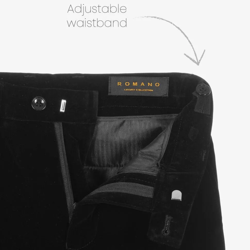 Black velvet evening and special occasion suit by Romano. It is beautifully tailored in plush velvet, with satin lapels, covered buttons and a faux pocket square. The trousers have a button and zip fastening, and a part-elasticated waist.