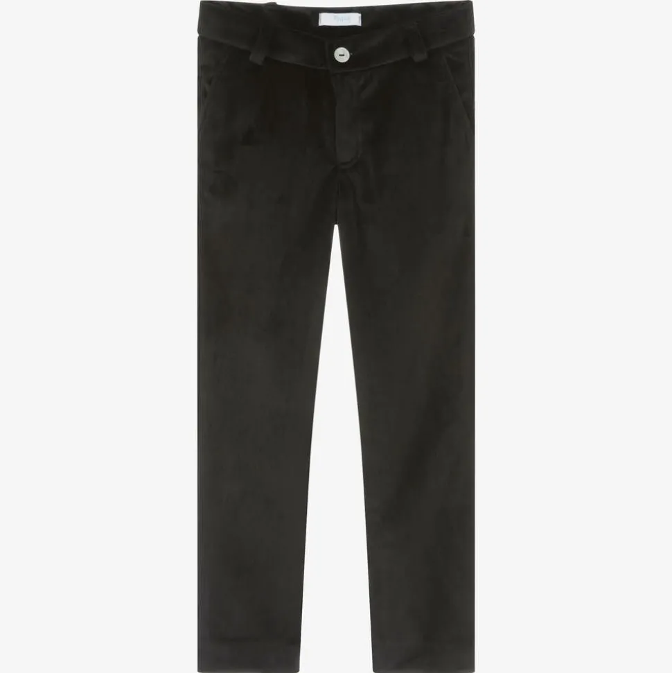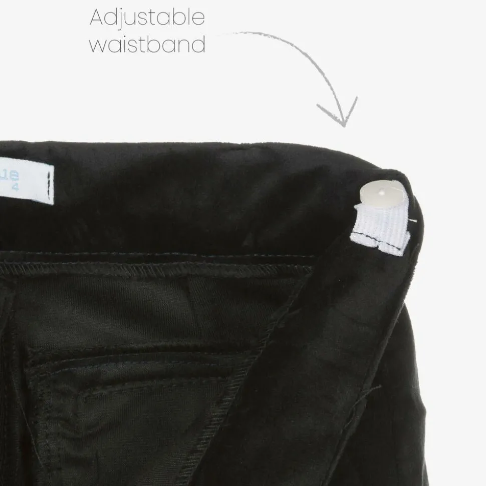 Exclusive to Childrensalon, these smart black trousers for boys by Spanish brand Foque, are made in a super soft velvet. Comfortable to wear, they have front and back pockets, fasten with a pearlescent button and zip and have an adjustable waistband to ensure a good fit.