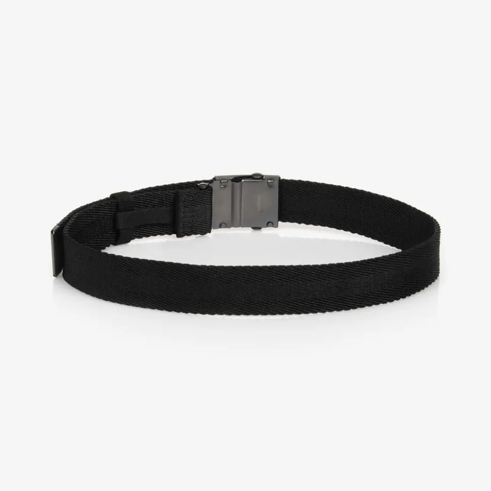 Black woven belt for boys by German brand BOSS, with cool matt silver metal hardware. Easy to fasten and adjust to fit, this casual accessory has a slider buckle with signature stripes and logo branding.