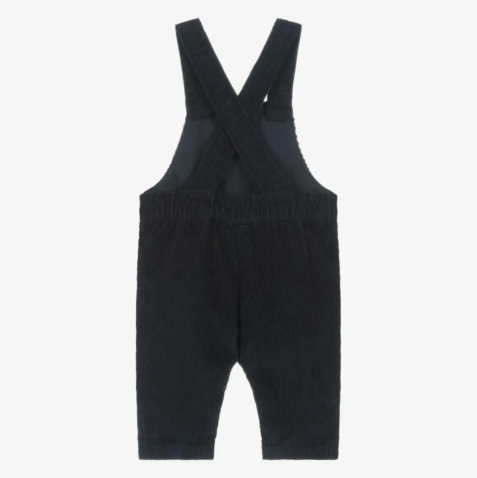 Navy blue corduroy dungarees for little boys by Petit Bateau, made in soft organic cotton. This cute style has a small bib front pocket, adjustable, button fastenings straps and useful poppers between the legs to help with changing. The French brand's signature sailboat logo can be seen as a small tab on the front.