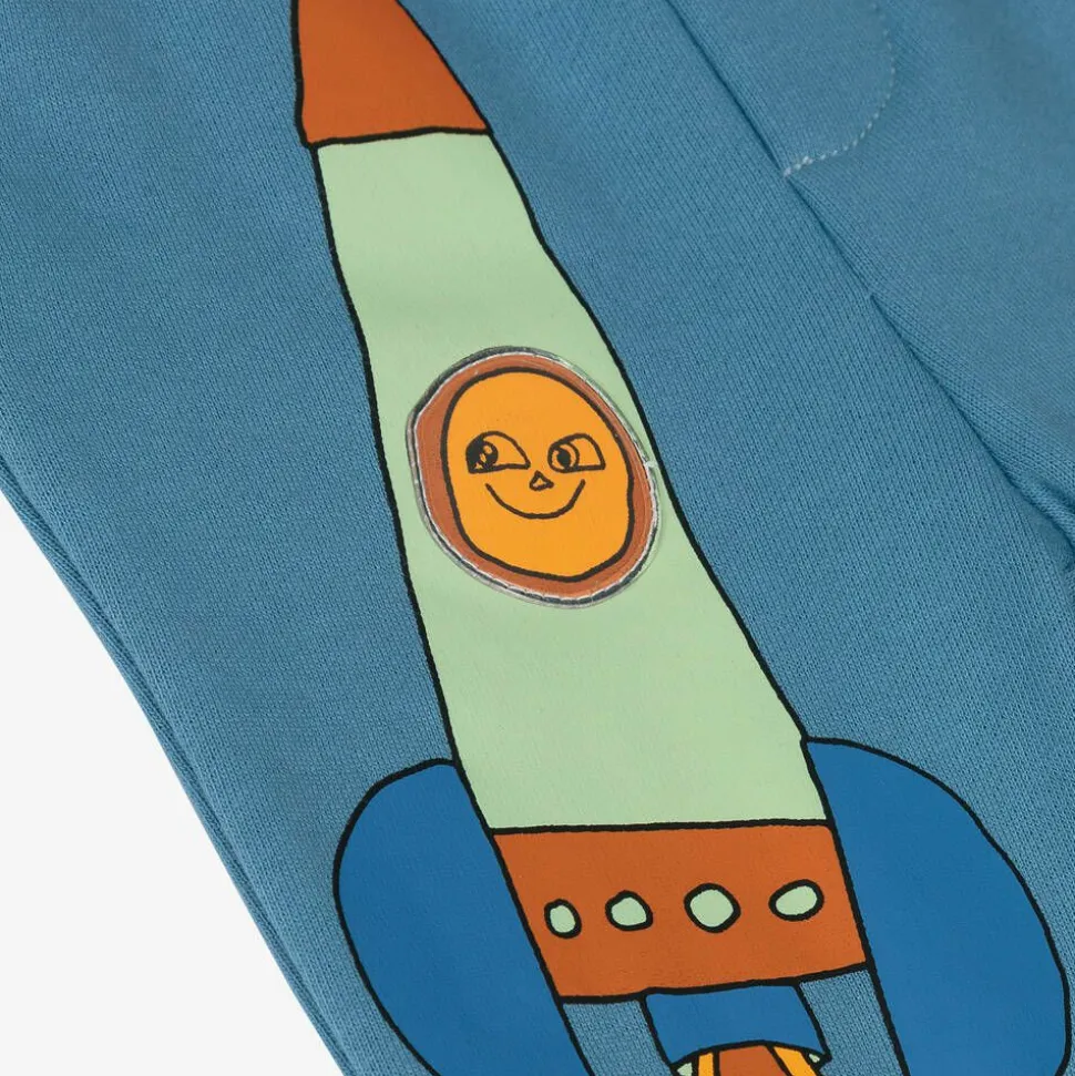Blue space-themed tracksuit for little boys by Stella McCartney Kids, made in organic cotton jersey with a soft fleecy inside. The sweatshirt has a colourful rocket and shooting star motif, comfortable ribbed trims and easy popper fastenings on one shoulder. The matching joggers have an easy drawstring waist, elasticated cuffs and a branded logo tab on the side seam. The Stella McCartney fit can be quite small so choose a size up if you want room to grow.