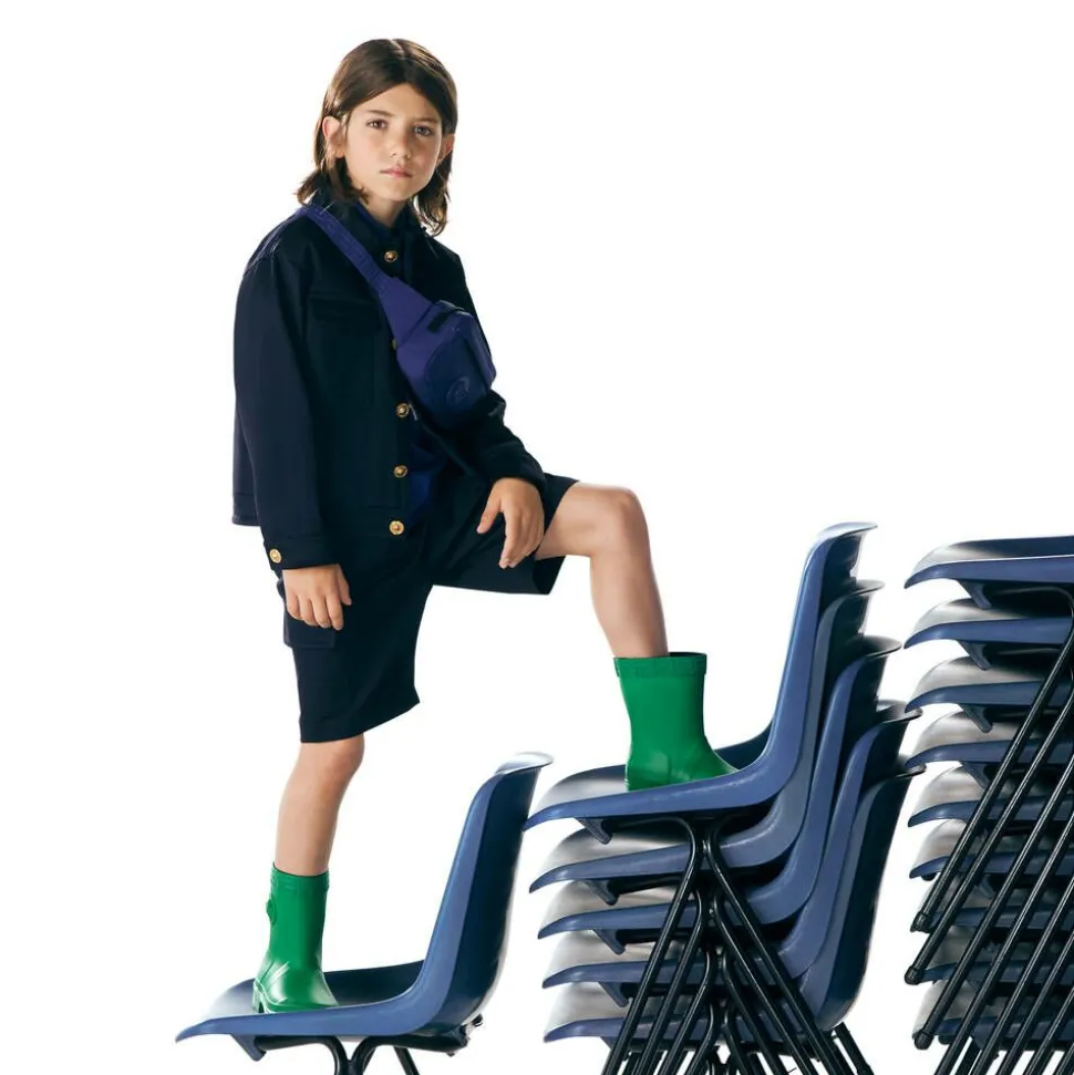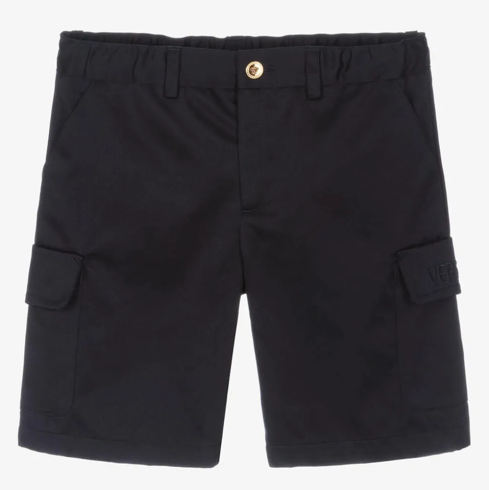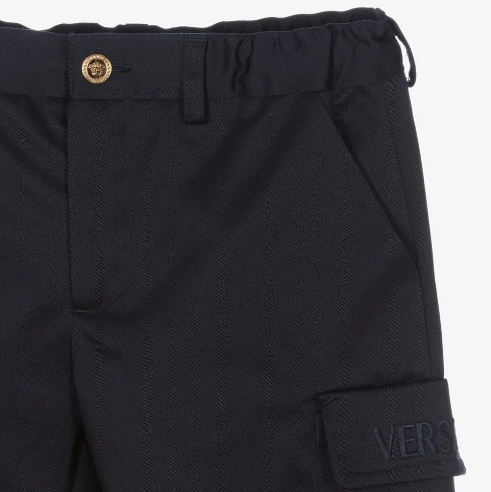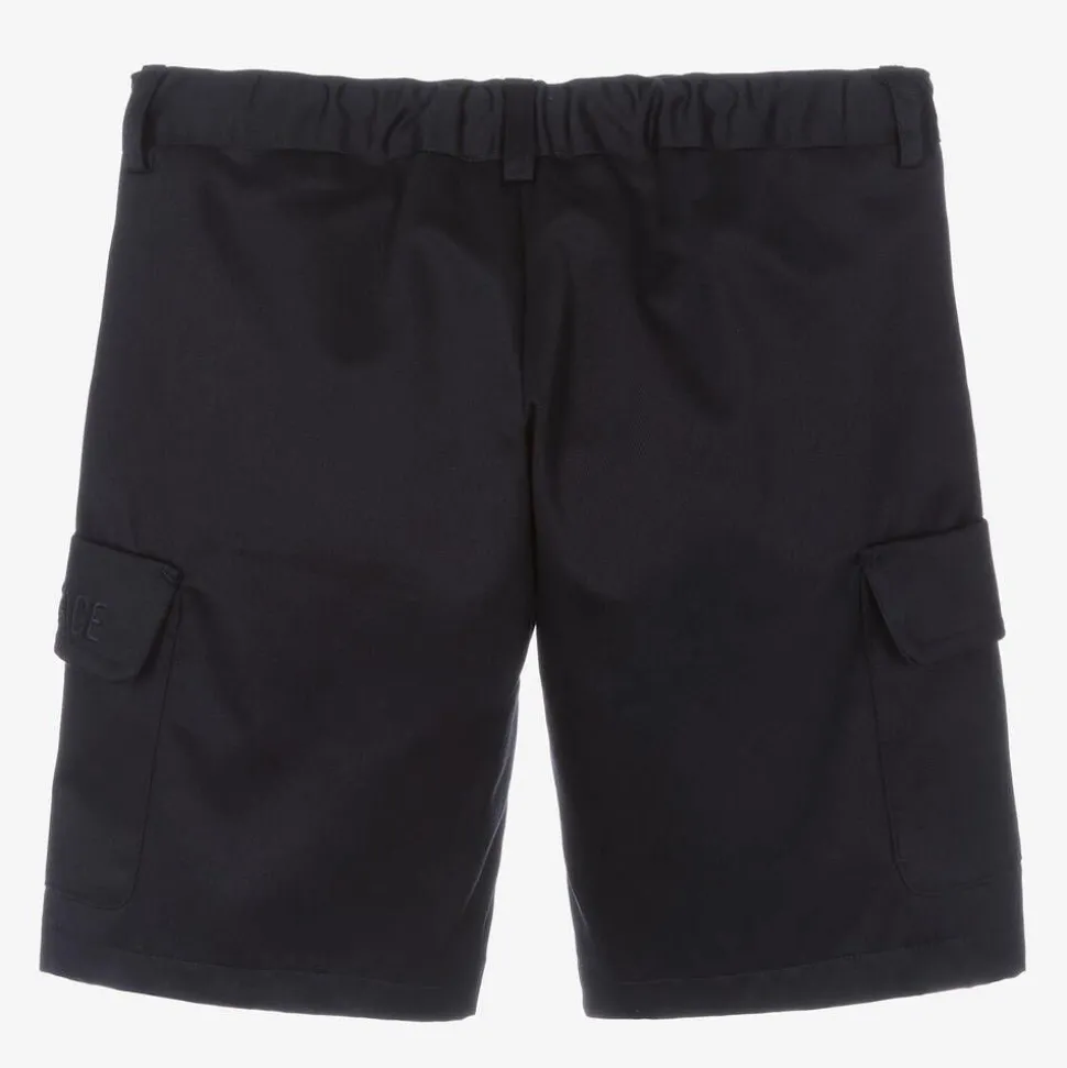 Elegant navy blue shorts for boys by Italian designer Versace, with cargo-style pockets on the legs. Made in cotton gabardine with a luxurious satin finish, these Bermuda-length shorts have an elasticated waistband and fasten with a zip and gold-tone Medusa button. The label's tonal embroidered logo can be seen on one pocket flap for a subtle designer finish.