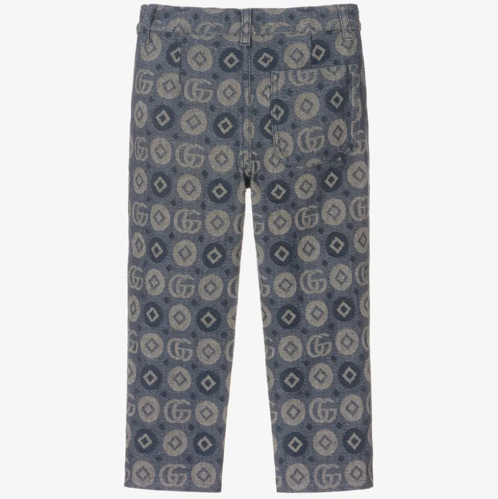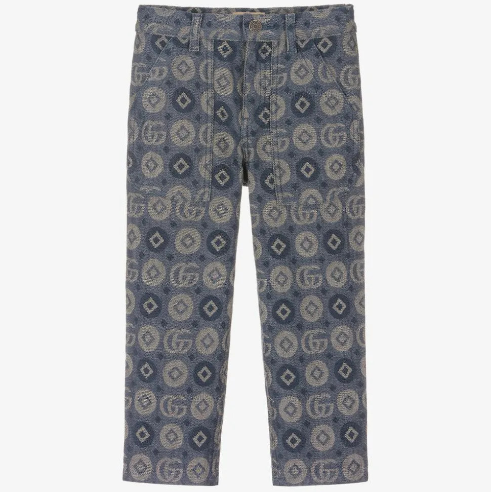Stylish blue trousers for boys by luxury Italian brand Gucci, with the iconic Double G logo in a statement geometric pattern. Woven in soft cotton jacquard, they have an adjustable waistband for a comfortable fit, with side and back pockets. There is a zip and clip fastening, with a branded button for a finishing designer touch.