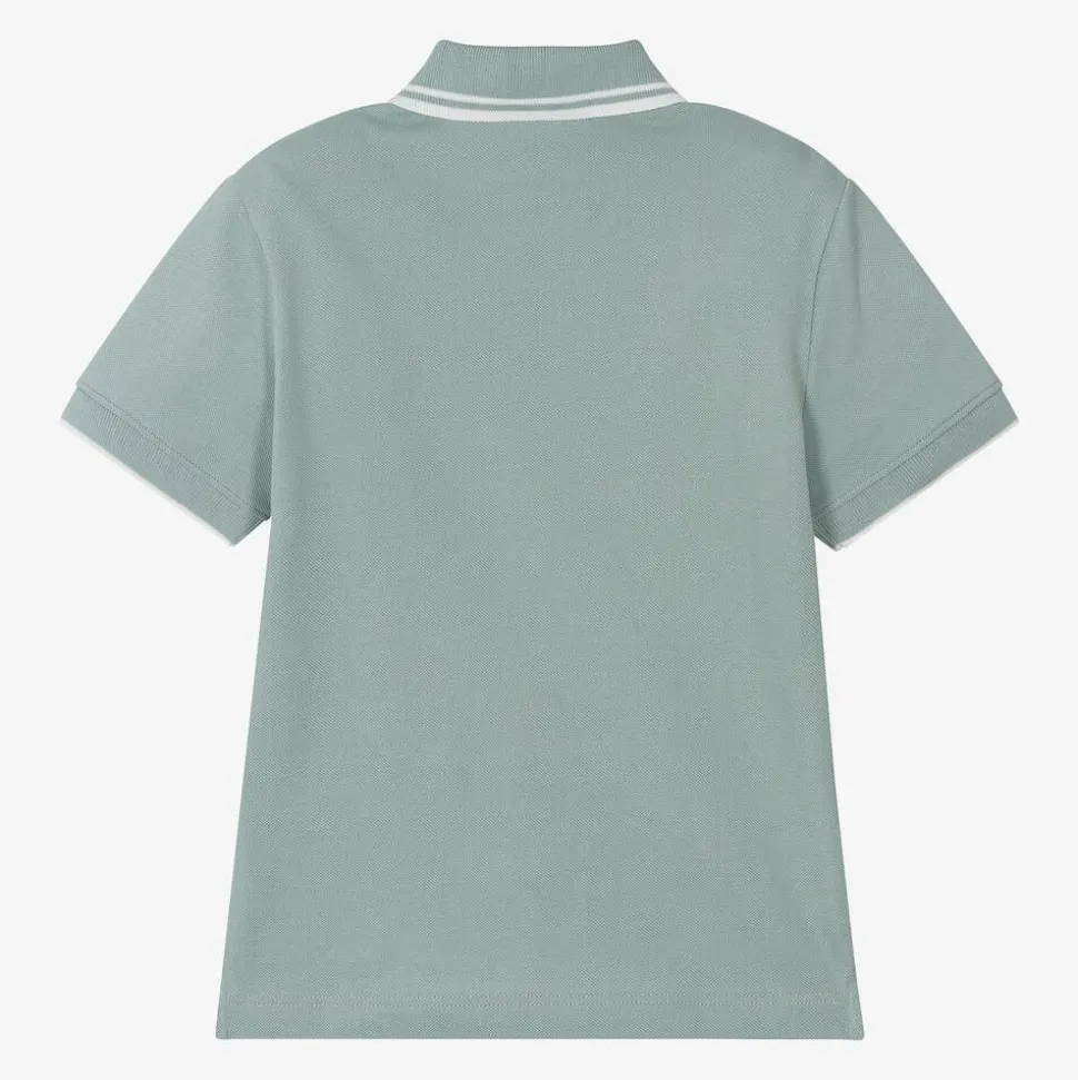 Green-blue cotton short-sleeved polo top for boys by iconic Italian designer Emporio Armani, with white tipping. Endlessly comfortable, it is made in soft, stretchy piqué, with branded buttons and an embroidered white Eagle logo on the placket. There are vents on the hemline for extra comfort.