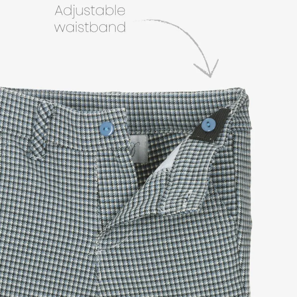 Traditionally styled blue cotton trouser set for little boys by Beau Kid. With a smart dogstooth pattern, the softly brushed, button-fastening trousers have an adjustable waistband and useful pockets. They come with a white poplin shirt and a cosy, blue knitted cardigan. A matching, lined cap completes the classic look.