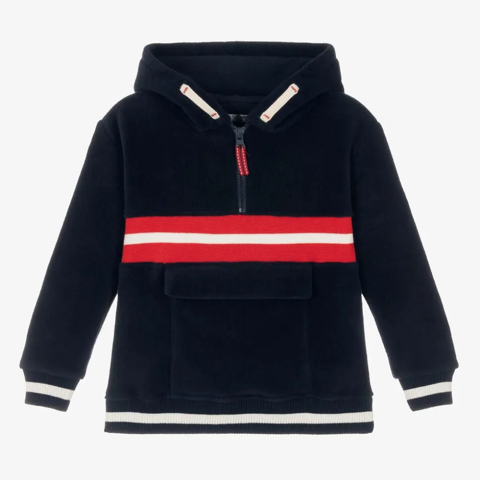 A navy blue hooded top for boys by Dr. Kid, made in super soft and cosy fleece. For a stylish contrast, it has a red and white striped, knitted panel across the front and white stripes on the ribbed trims. The hood is lined in soft jersey, with decorative tape detail and a quarter zip fastening at the neck. There is a flap pocket on the front, adding a practical touch to this casual style.