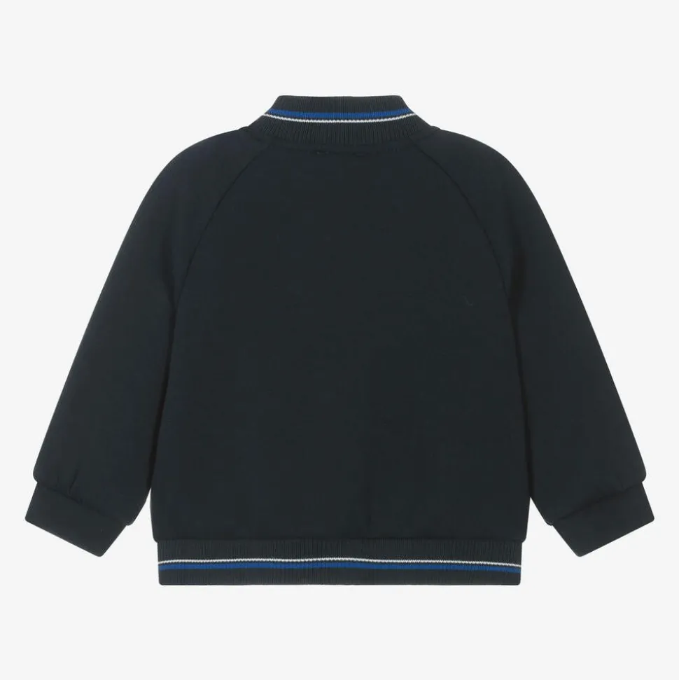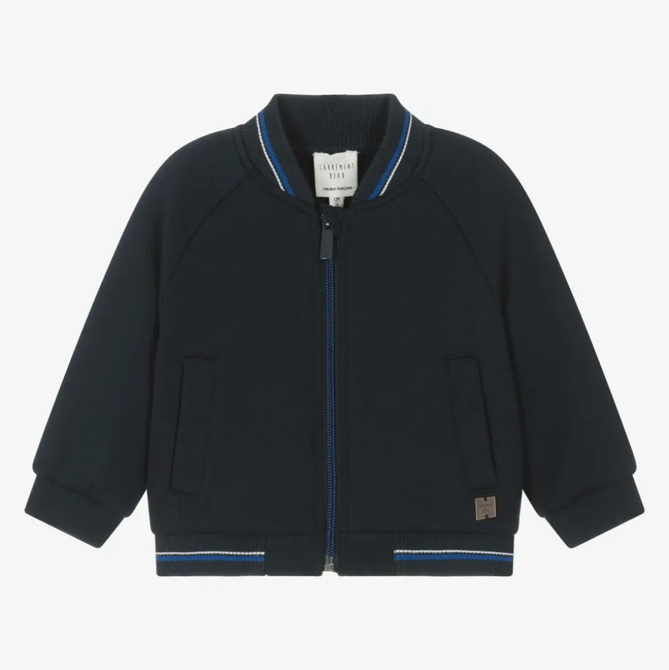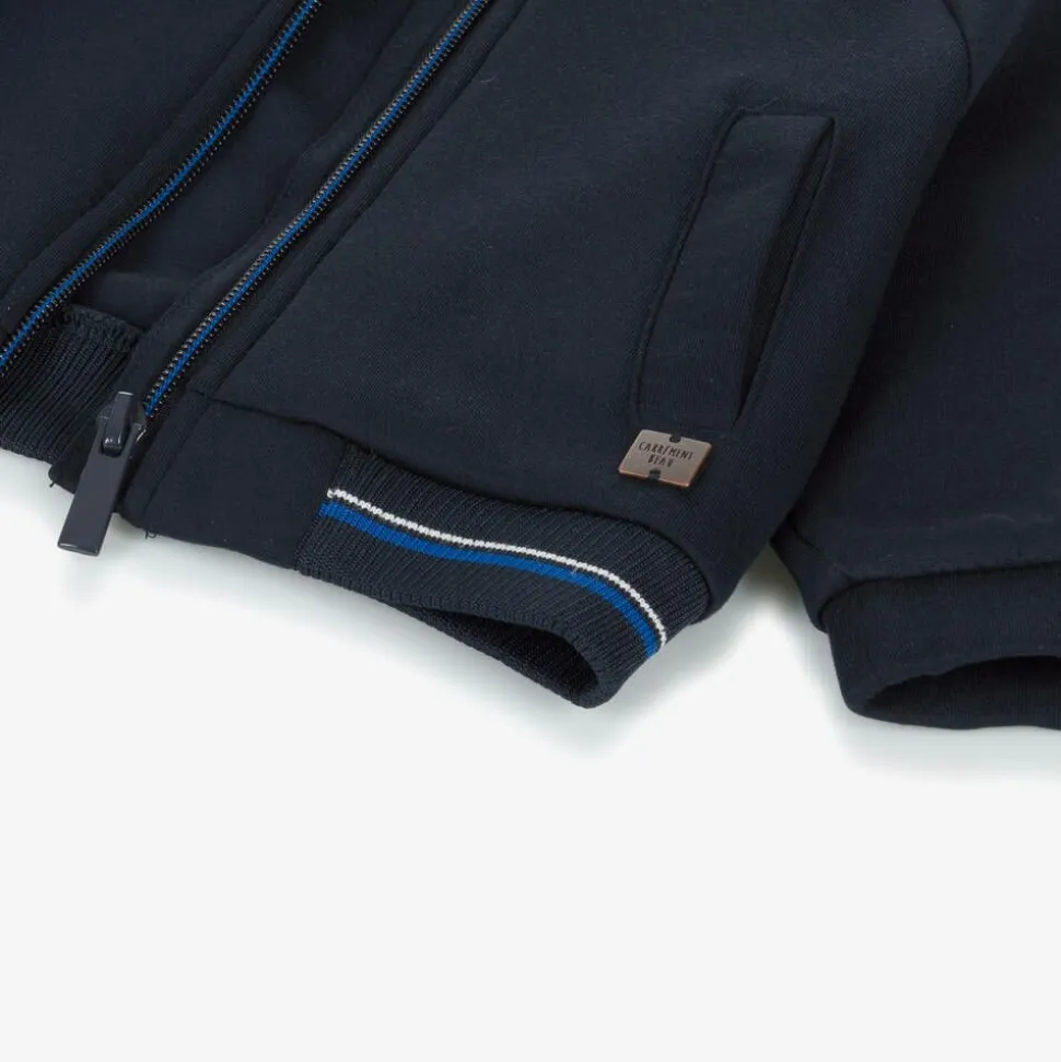 Navy blue zip-up top for little boys by Carrément Beau, made in soft and comfortable Milano jersey. It has a ribbed collar and hem with contrasting blue and white stripes, and useful front pockets. A logo plate can be seen above the hem for a discreet branded touch.