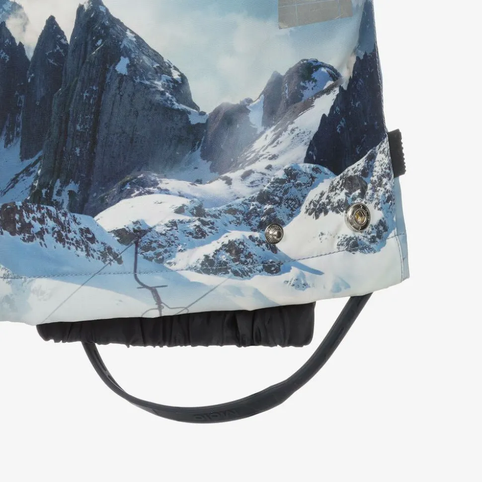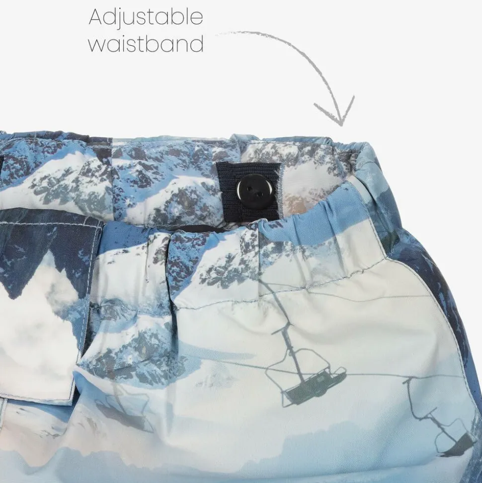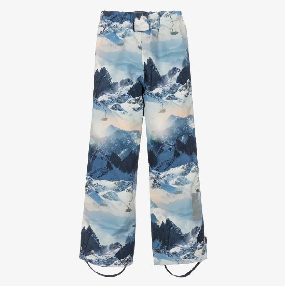 Blue technical ski trousers for boys by Molo, patterned with a cool snowy mountain print. Waterproof, windproof and breathable, are made from durable, recycled fabric with warm yet lightweight padding. They feature internal gaiters, removable rubber stirrups on smaller sizes and a reflective logo print on one leg for added visibility. Simply pull on, the waistband is elasticated and adjustable, with velcro belt loops and popper fastening ankle cuffs for a good fit.