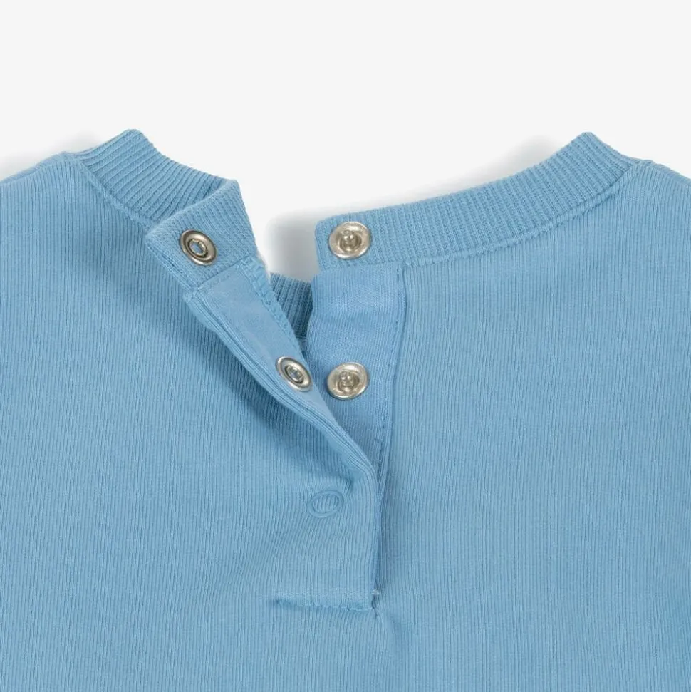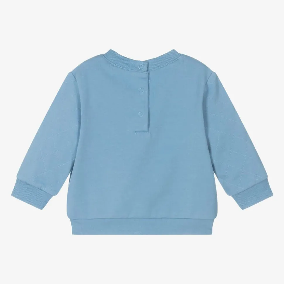 Blue sweatshirt for little boys by Carrément Beau, made in soft organic cotton jersey with comfortable ribbed trims. Fleecy on the inside, it has a casual crew neck and a diamond stitch pattern on the sleeves. There is a cute fox print on the front, wearing embroidered red glasses. On the back, are convenient popper fastenings for easy dressing.