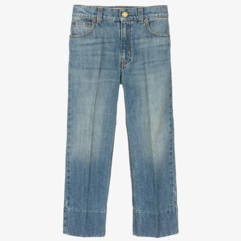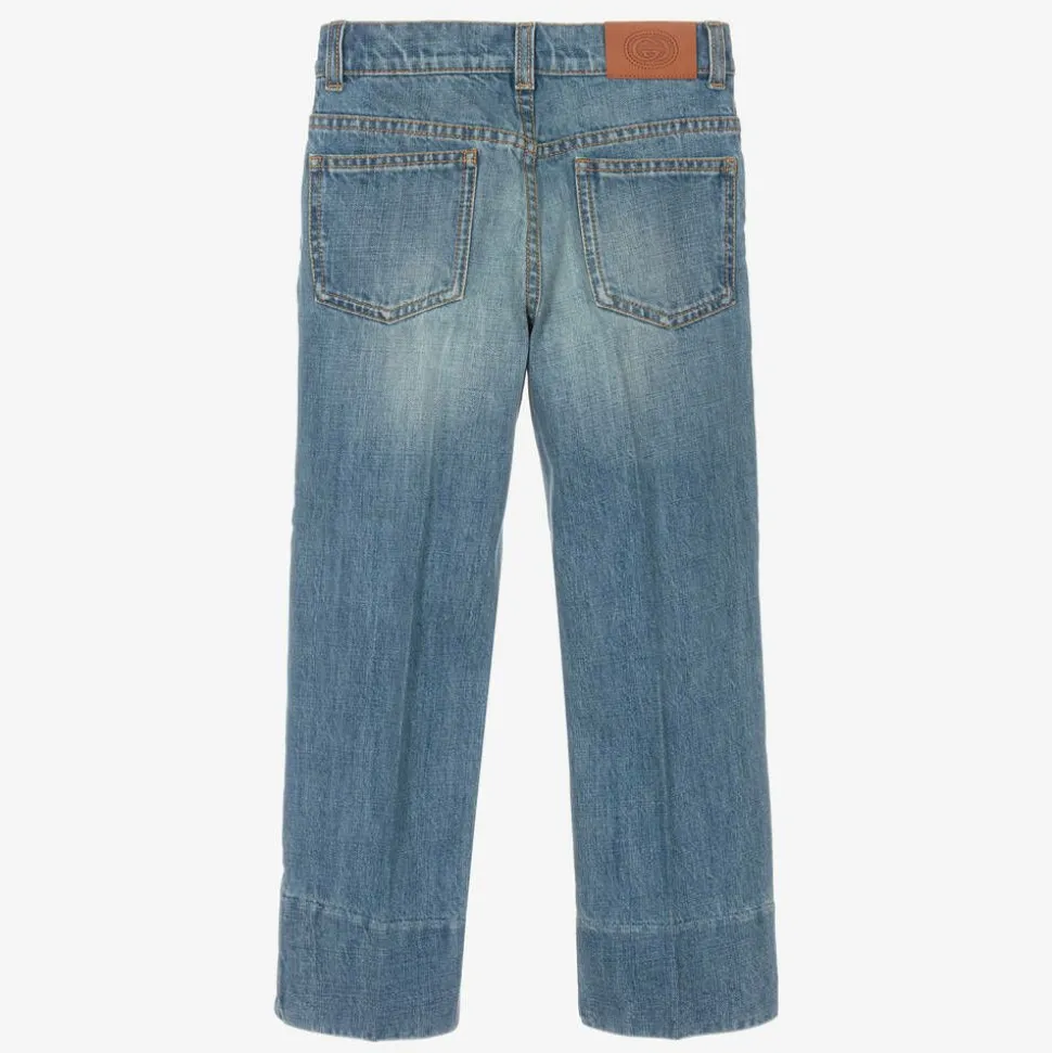 Blue stone-washed jeans for boys by luxury Italian fashion house Gucci, woven in the softest cotton denim. Cut in a classic straight-leg design, they feature the signature Interlocking G logo on the leather badge for an unmistakable designer look. Fastening with a gold logo-embossed hook and zip, the adjustable waistband creates an ideal fit.