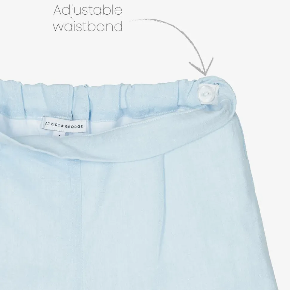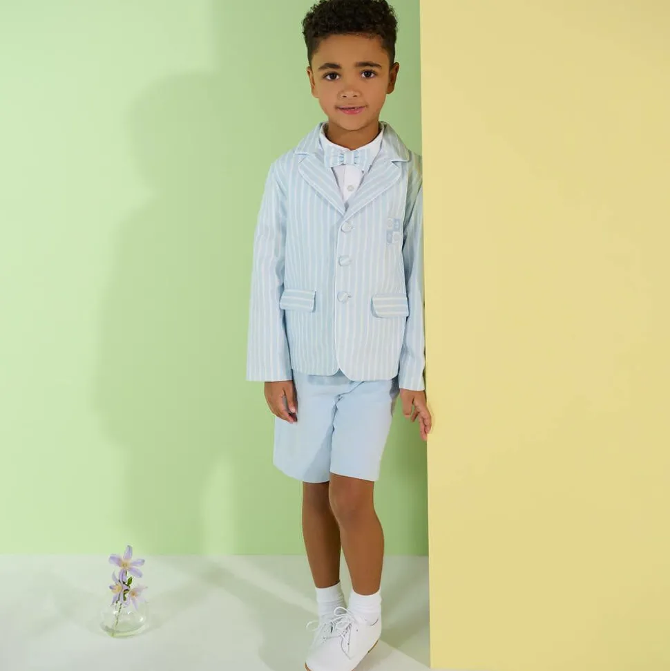 Smart pale blue five piece shorts suit for boys by British heritage brand Beatrice & George, exclusive to Childrensalon. Made in a cool cotton and linen blend, the jacket is boldly striped in white, with fabric-covered button fastenings, an embroidered crest logo badge and pockets on the front. It is lined in white satin for comfort and comes with a matching waistcoat. The lined, pale blue shorts have an adjustable waistband that is elasticated around the back for a good fit. A white cotton shirt and a detachable, striped bow tie complete the look.