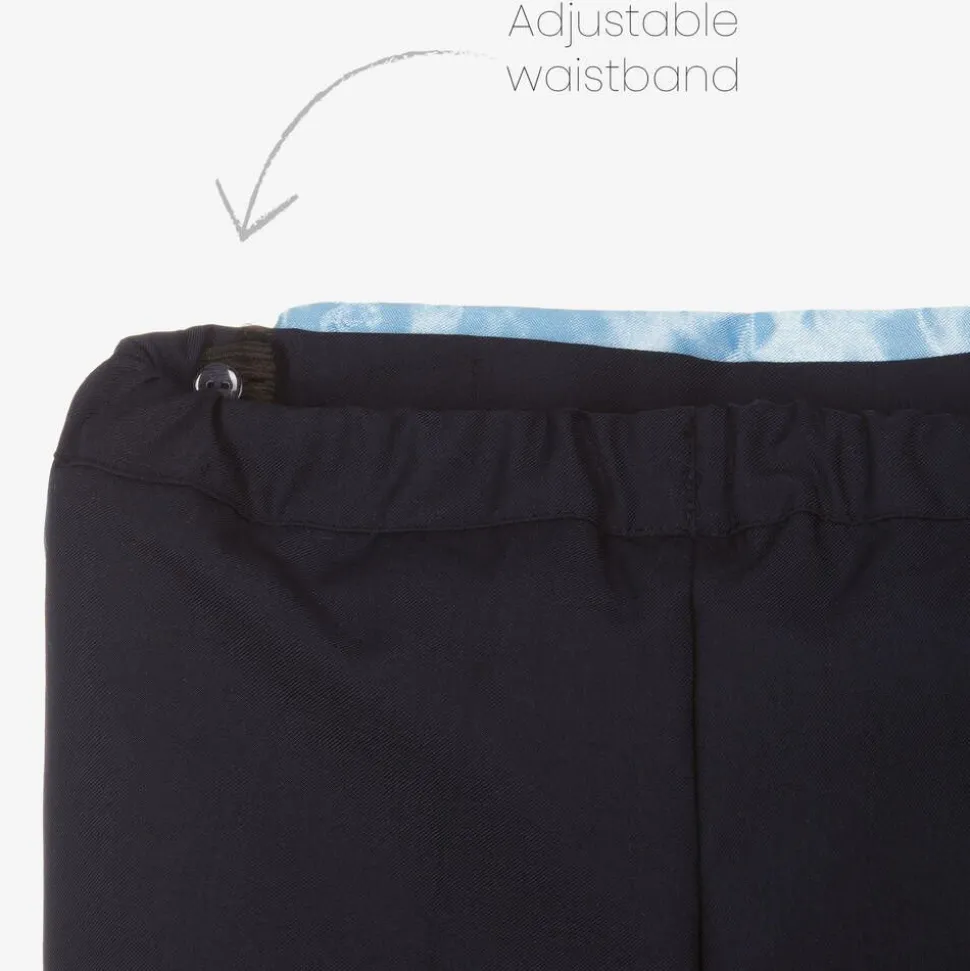 A charming blue suit for little boys by Andreeatex. Made from soft velour with a lightweight cotton lining, the pale blue blazer has a smart revere collar, a faux pocket square pocket on the chest, faux flap pockets on the waist, and crest-style button fastenings on the front. The white button-up long-sleeved shirt has frilled trims, blue piping, and a colourful bowtie that fastens with poppers under the smart pointed collar. Made from smooth twill, the lightly lined trousers have a silky blue buttoned cummerbund decoration on the front and a comfortable elasticated waistband.