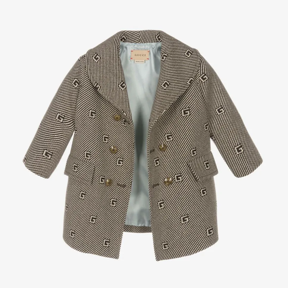 Smart brown and beige double-breasted wool coat for little boys by luxury Italian brand Gucci. Taking inspiration from the 70s-style, the diagonal striped pattern features the brand's Square G jacquard logo. To complete the look there are two flap pockets and beige, logo embossed buttons to fasten on the front. Woven in a wool and cotton blend, it has a pale blue silky lining for added comfort.