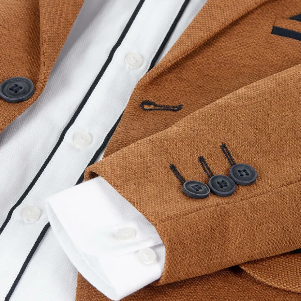 Smart tan brown and navy blue five piece suit for boys by Beau KiD, comprising a suit, bow tie, belt, and shirt. The marl brown blazer has navy blue trims and elbow patches, with a matching, removable pocket square and front button fastenings. The white cotton shirt also has navy blue trims and roll-up sleeves secured with buttons. The navy blue chino trousers have an adjustable waist for a good fit and useful front pockets. The suit comes with a coordinating, adjustable bow tie and a navy blue belt.