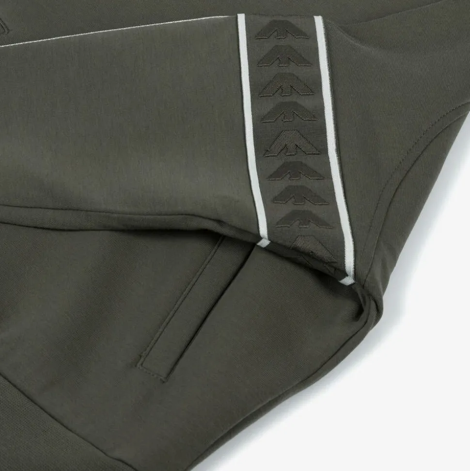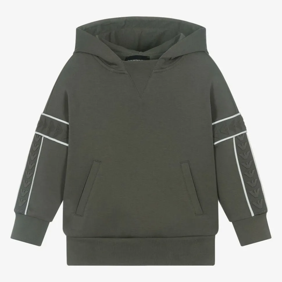 A khaki green hoodie for boys by Italian brand Emporio Armani, made in a wonderfully soft and stretchy cotton blend jersey. Ideal for adding a designer touch to their casual wardrobe, this comfortable top has dropped long sleeves detailed with the brand's iconic Eagle logo. To complete the relaxed look, it is styled with useful pockets on the front, a jersey-lined hood and stretchy ribbed cuffs and hem.