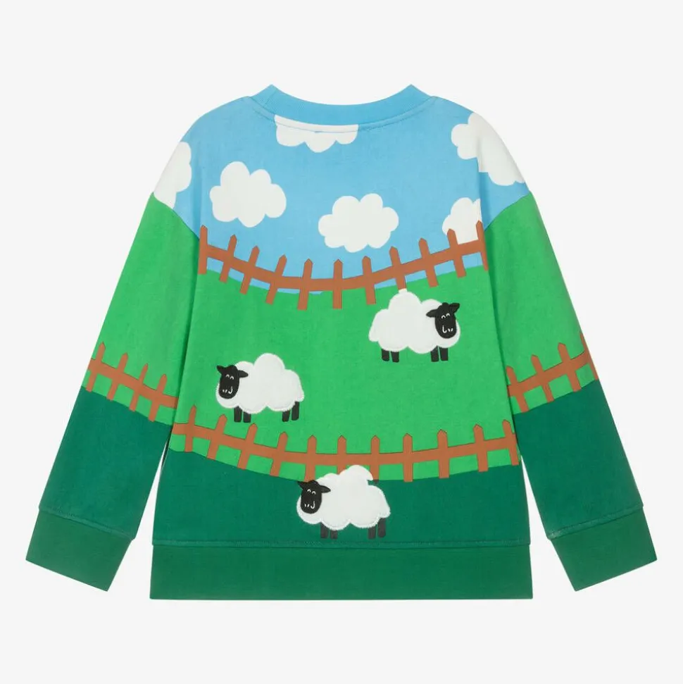 In shades of blue and green, this organic cotton sweatshirt for boys is by Stella McCartney Kids. With a fun farmyard theme, it features a cloud-filled sky and fluffy white sheep fenced in fields of green. This casual long-sleeved top is made mid-weight jersey, with ribbed trims and a cosy fleecy inside. The Stella McCartney fit can be quite small so choose a size up if you want room to grow.