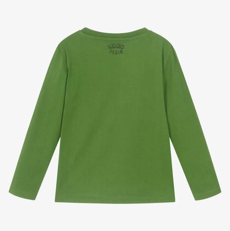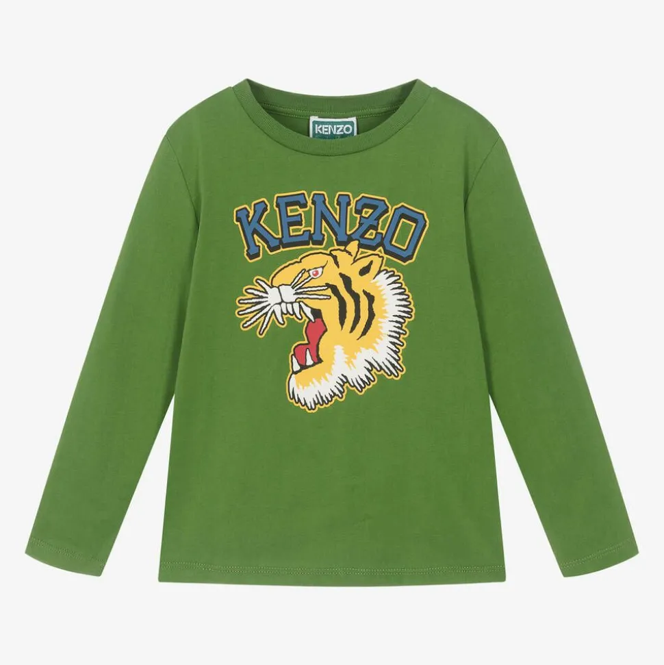 Green long-sleeved T-shirt for boys by KENZO KIDS, with the French brand's bold Varsity Tiger print on the front. It is made from soft cotton jersey with a finely ribbed crew neck and a Kenzo Paris logo printed on the back.