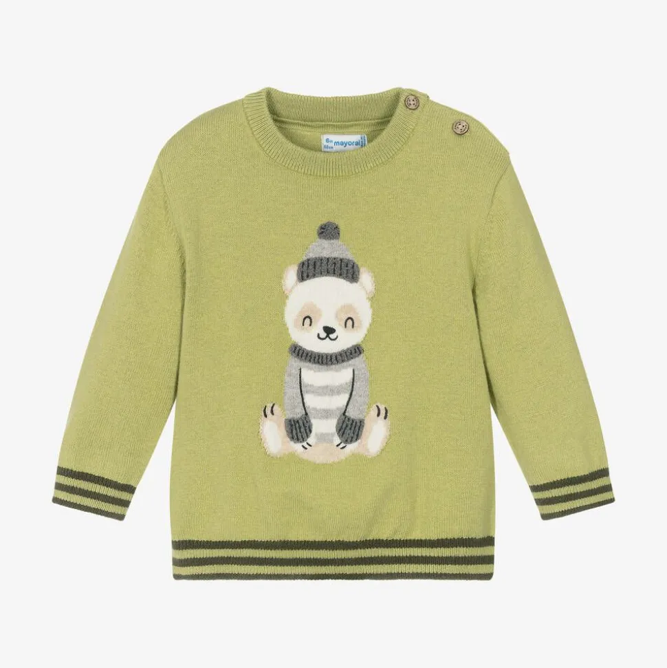 A lovely green sweater for little boys by Mayoral, knitted in a soft blend of cotton and wool. It has a cute polar bear motif on the front, wearing a cosy hat and jumper in grey and white. This sweet top has a crew neckline, striped ribbed trims, and button fastenings on one shoulder to help with dressing.