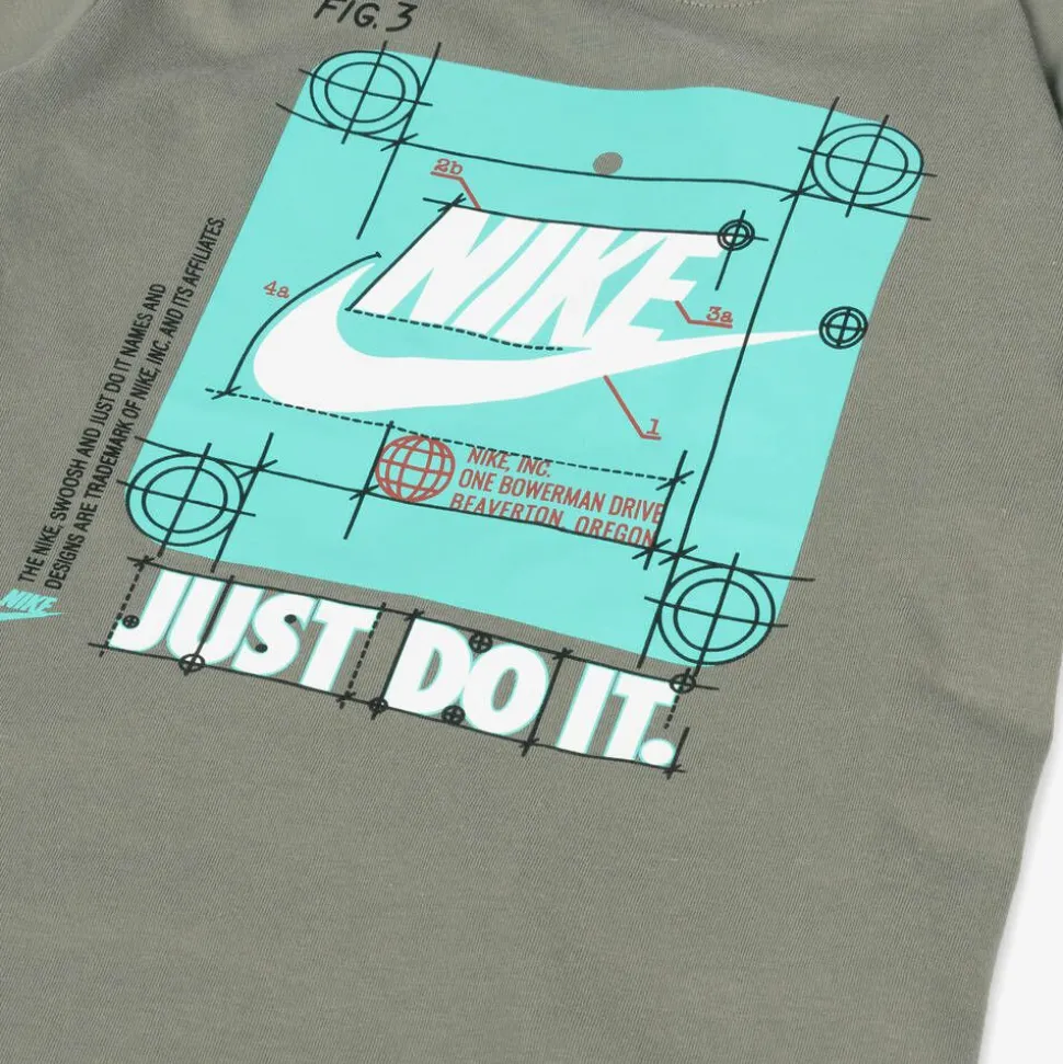 Dark sage green short-sleeved T-shirt for boys by Nike, made in a soft cotton jersey blend. This casual tee has a ribbed crew neck and a black Swoosh logo print on the sleeve. A turquoise blue target graphic is printed on the front, featuring the American brand's Swoosh logo and iconic 'Just Do It' slogan.