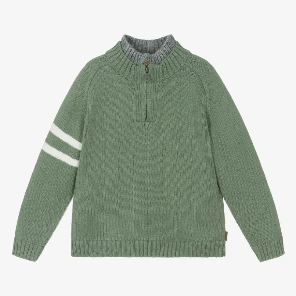 A practical green sweater for boys by Boboli knitted in a cotton blend. Ideal for cooler days, it has a half zip fastening with a branded zip and a contrasting grey collar with button fastenings underneath to give the illusion of a layered look.