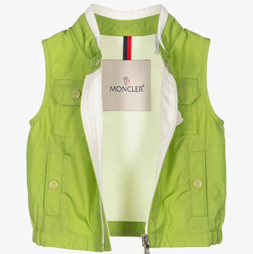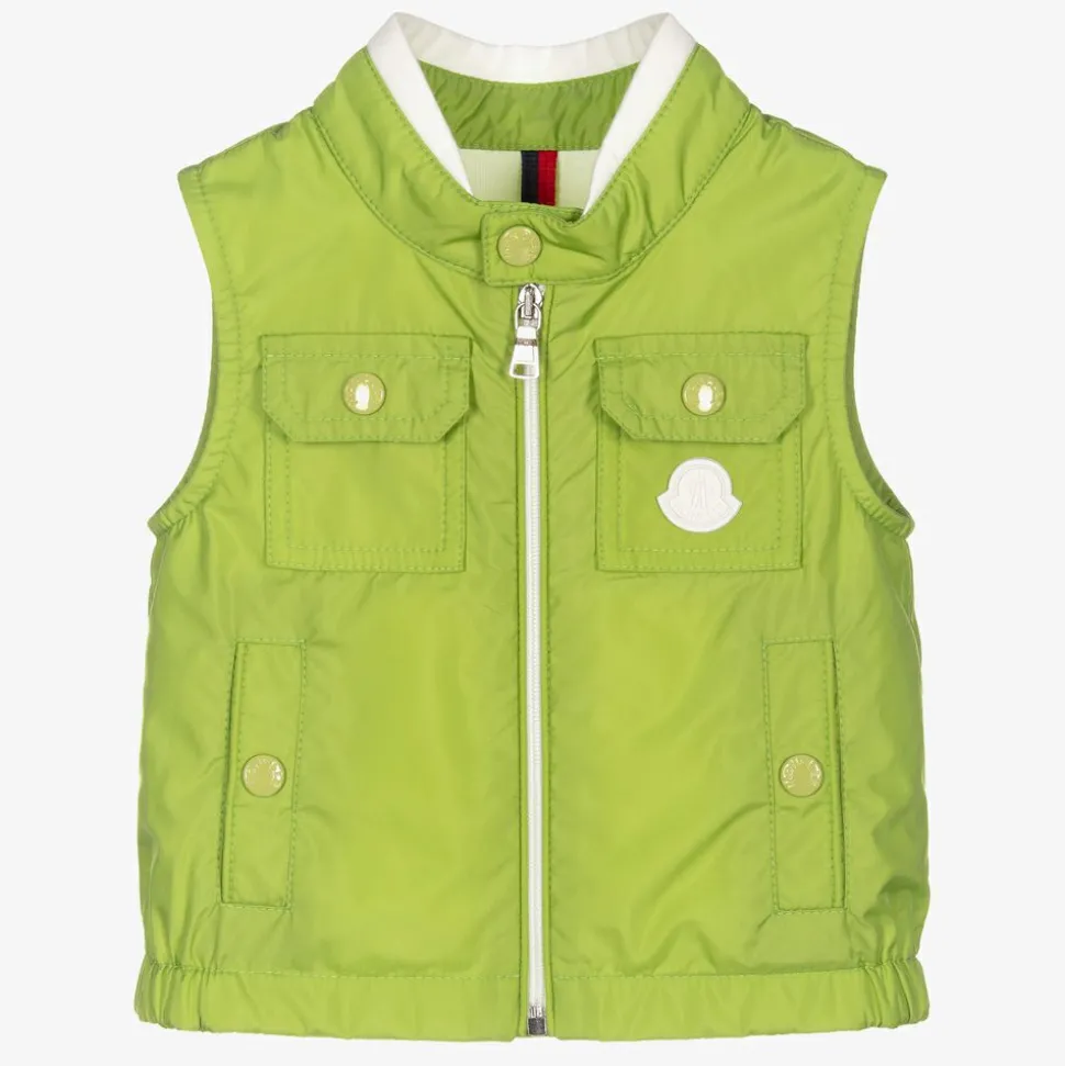 Lime green gilet for little boys by luxury French brand Moncler Enfant, made in silky water repellent nylon. It has utility style pockets with four front popper pockets, and a popper closing collar. Fastening with a zip on the front, it has the brand's iconic white logo badge and a white collar trim. The lining is made in soft cotton jersey.
