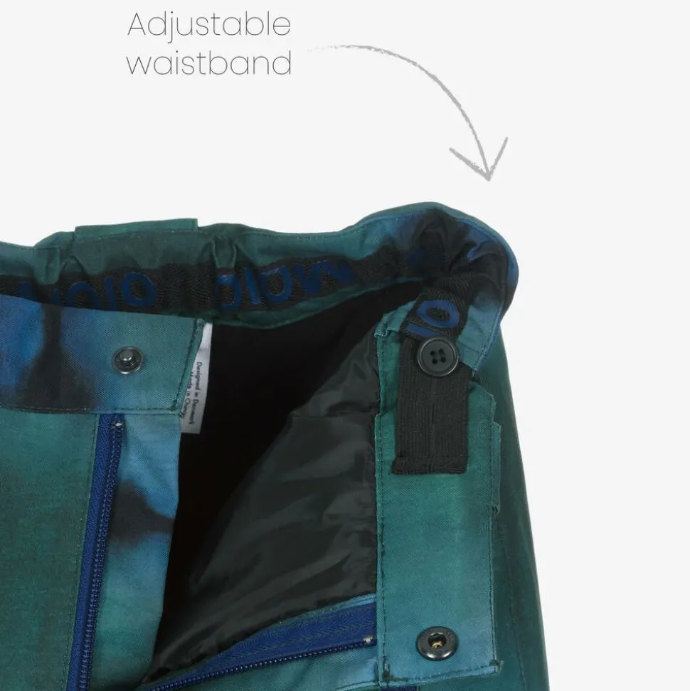 Padded green and blue tie-dye print ski trousers by Molo, ideal for keeping boys dry, warm and visible on the slopes. Made in smooth, durable fabric from recycled materials, these breathable trousers have lightweight insulation and are lined in cosy fleece and satin. They have velcro cuffs with elasticated, popper-fastening internal gaiters and removable rubber stirrups. The waistband is adjustable for a great fit and has velcro-fastening belt loops. There is reflective detailing on one leg for visibility.