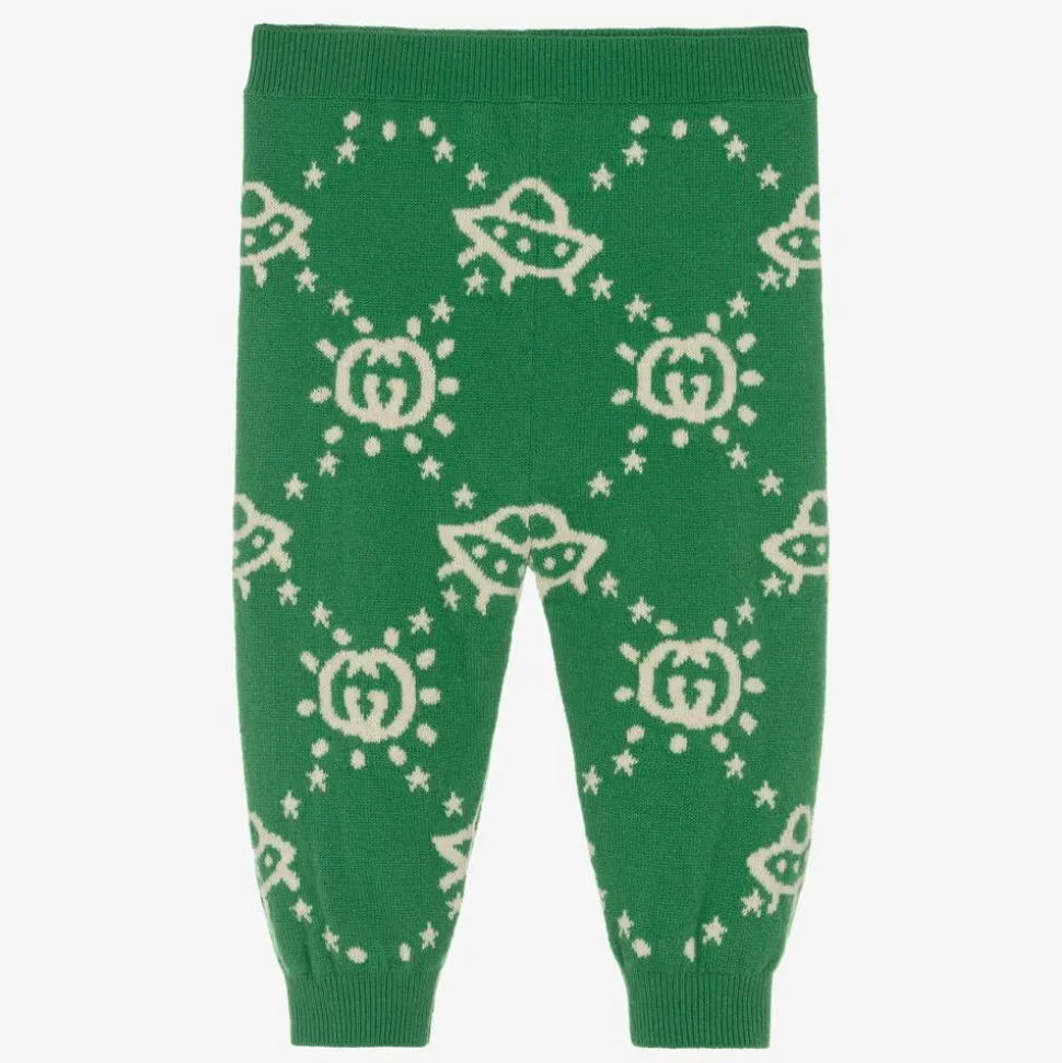 Green intarsia knit trousers for little boys by luxury designer Gucci, made in soft wool. A combination of signature style and comfort, these pull-on trousers have lightly ribbed trims and a stretchy waistband. Interlocking G logos and UFO motifs can be seen within the knit, bringing a touch of the Italian House's playful spirit.
