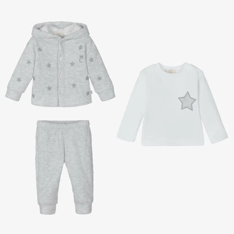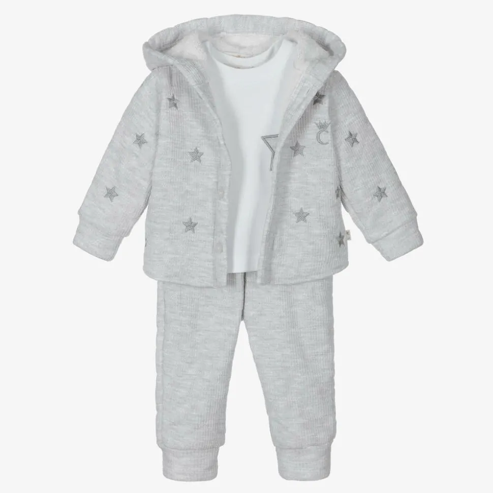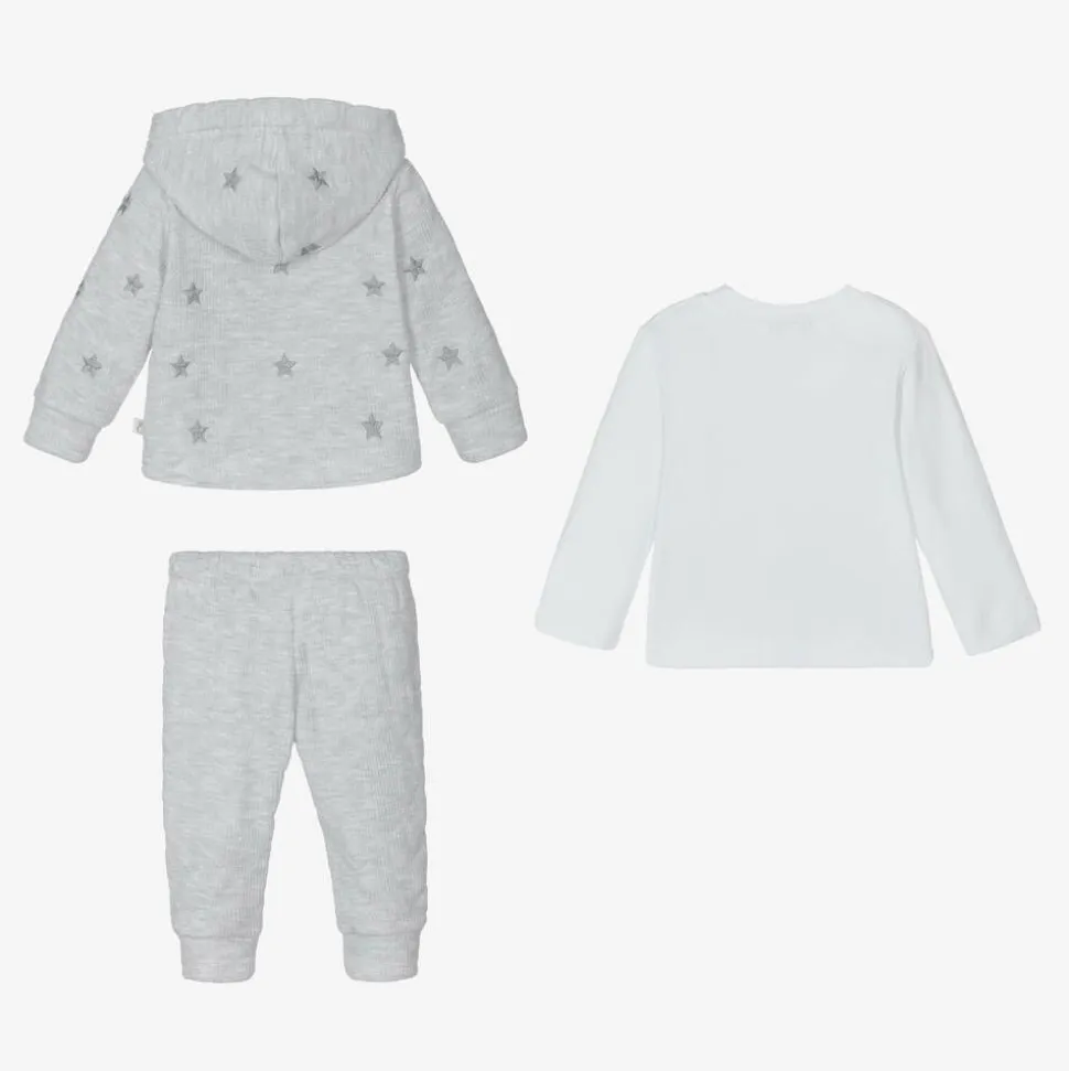Wonderfully cosy pale grey tracksuit for little boys by Caramelo Kids, comprising a hoodie, joggers and a long sleeve top. Both the hoodie and joggers are made from a super soft waffle jersey, with an extra cosy teddy fleece lining. There is an embroidered blue-grey star design across the hoodie and white cotton top, for a co-ordinated look. Easy to dress, the hoodie fastens with clear buttons.