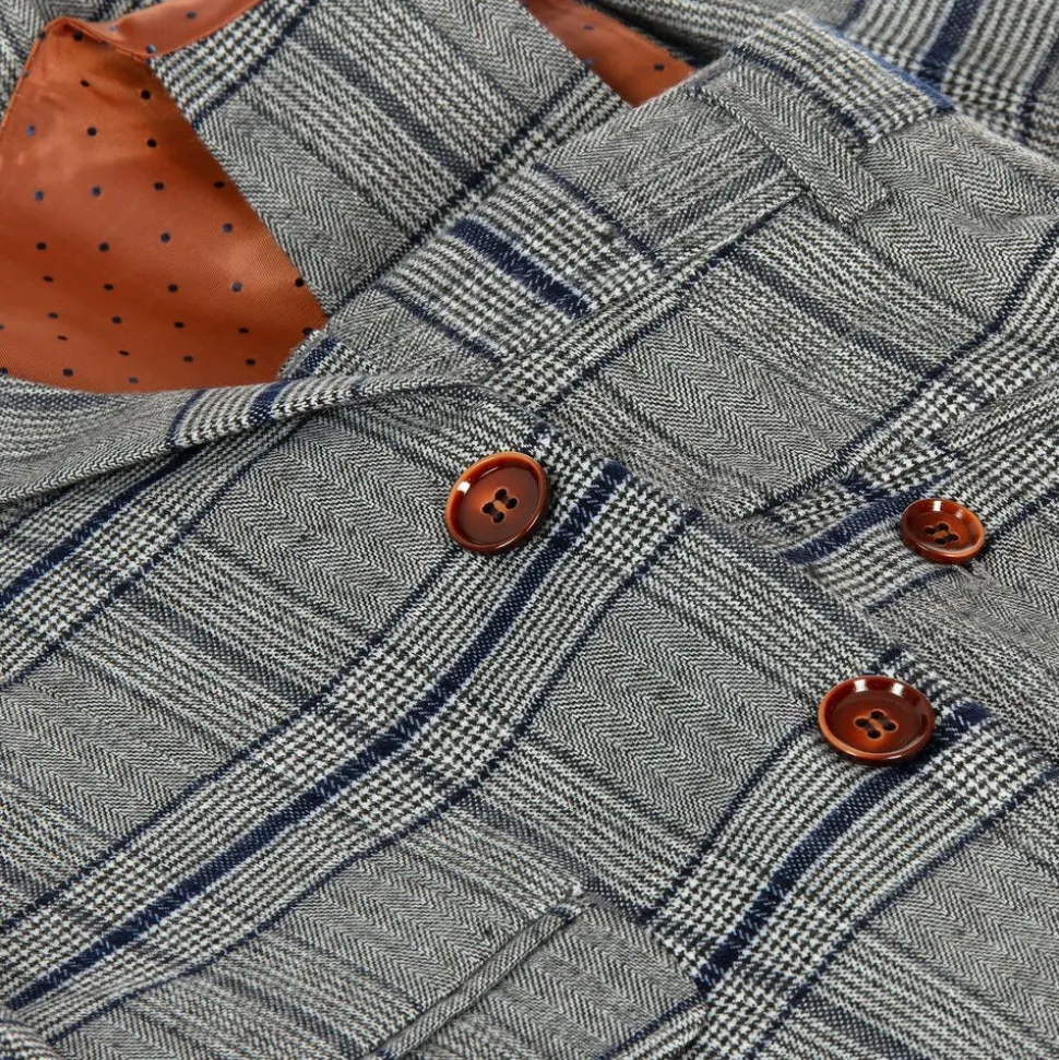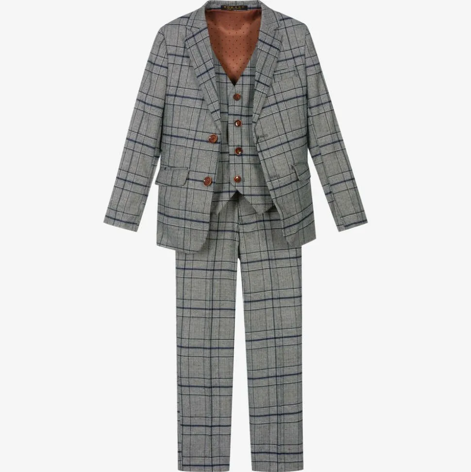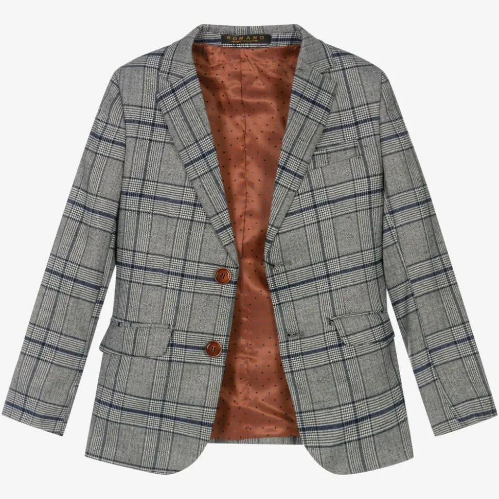 Grey and navy blue suit for boys from British brand Romano. Timelessly smart, all pieces are patterned with check and woven in soft, mid-weight fabric. Traditionally styled, the tailored jacket has brown mock horn buttons, useful front pockets and a comfortably smooth satin lining. In grey check on the front and bronze satin on the back, the waistcoat features front pockets and an adjustable strap on the back for a good fit. The straight-leg trousers have an adjustable waist, pockets and an easy-to-fasten front zip, hook and eye and button for ease of dressing.