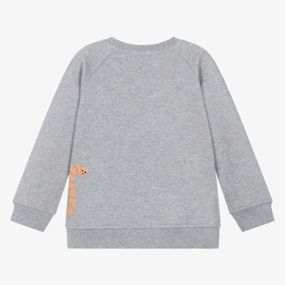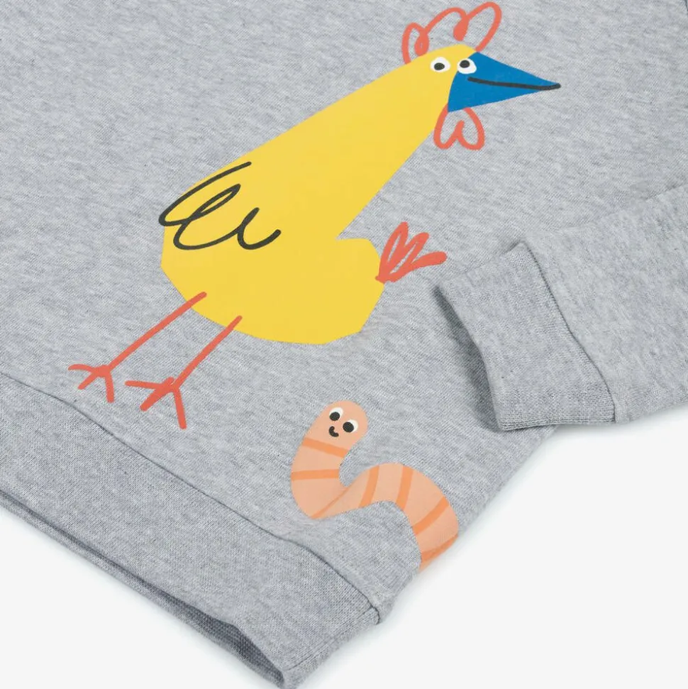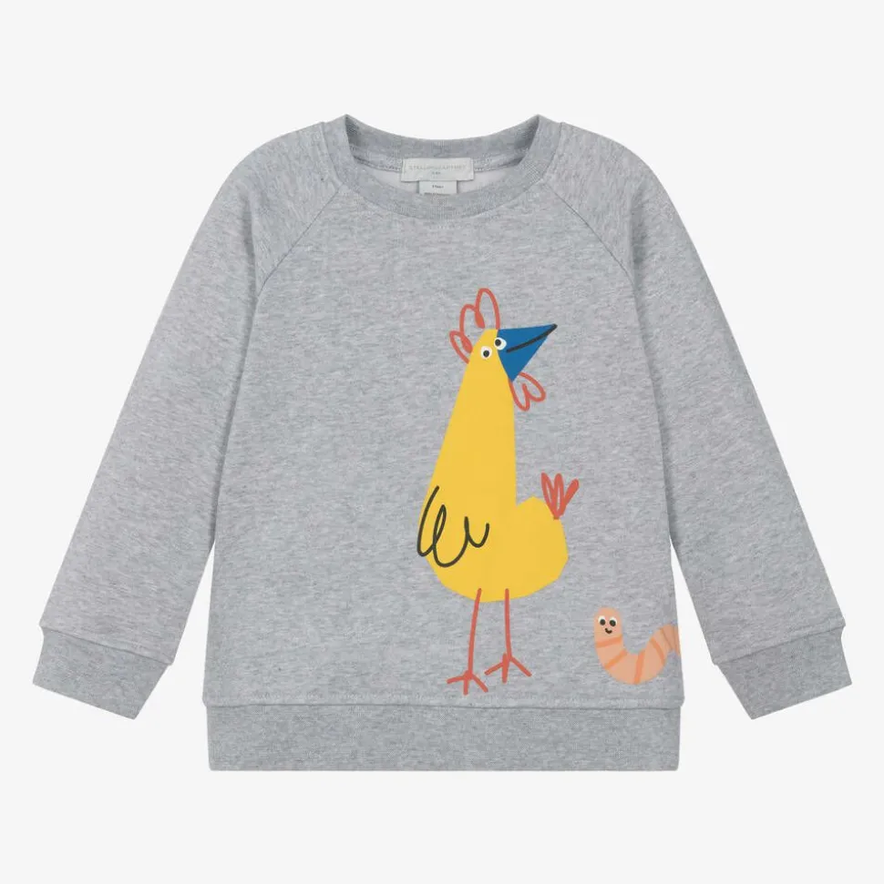 Casual and comfortable for boys, a grey marl sweatshirt by Stella McCartney Kids. Featuring a farm animal theme, it has a fun chicken and worm motif printed on the front. Made in soft organic cotton jersey, it has long sleeves and a cosy fleecy inside. The Stella McCartney fit can be quite small so choose a size up if you want room to grow.