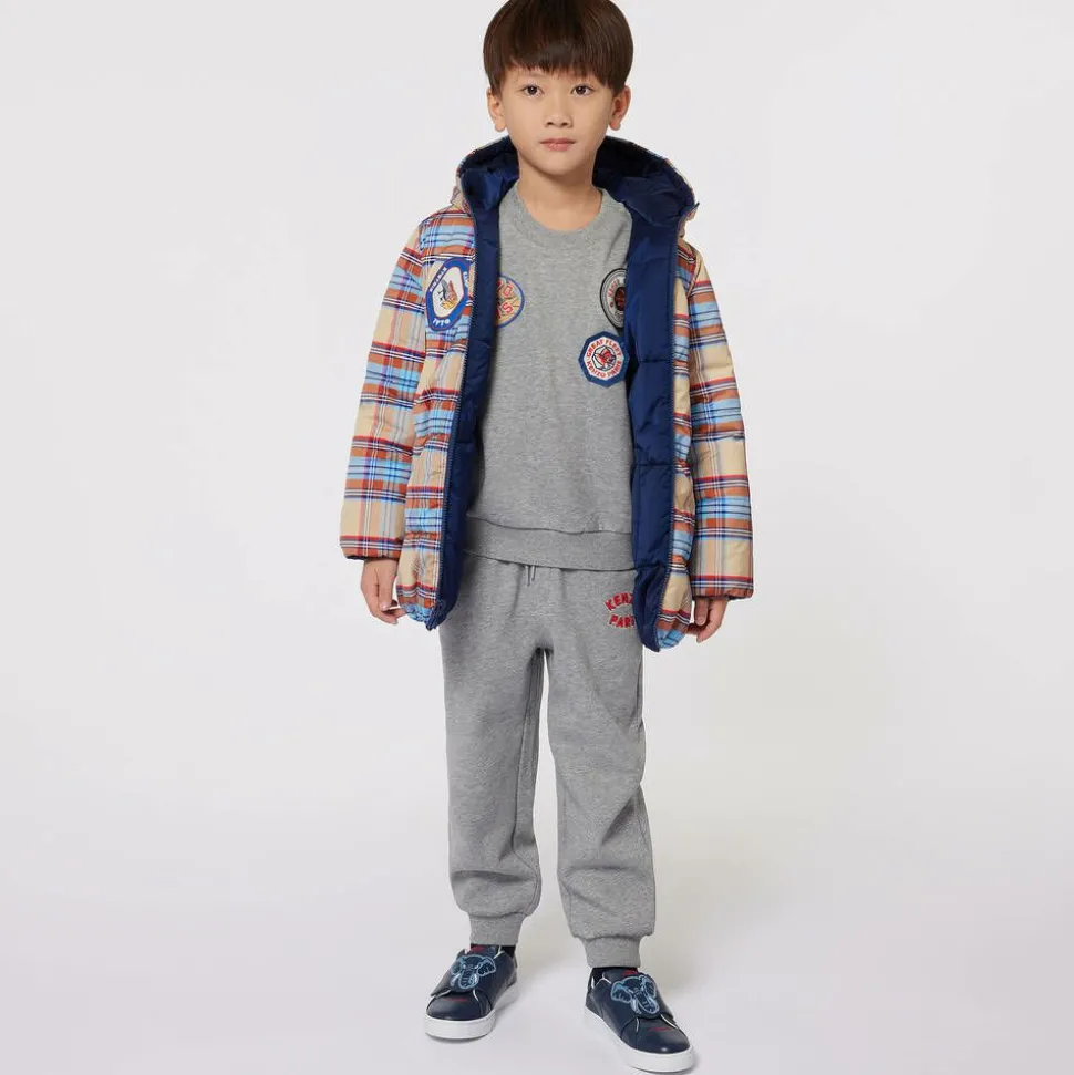 Grey marl sweatshirt for boys by French brand KENZO KIDS, made in a mid-weight cotton jersey blend. For instant brand recognition, it has travel-inspired logo patches on the front and a red bouclé logo on the back. It has a warm, fleecy inside and long sleeves with cosy ribbed cuffs.