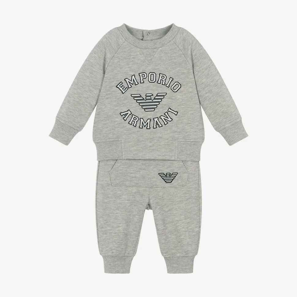 Casual and comfortable for little boys, this grey marl tracksuit is by Italian fashion house Emporio Armani. For designer appeal, the sweatshirt has a raised navy blue and white logo on the front, with branded popper fastenings on the back. The joggers have a gently elasticated waist, with a coordinating Eagle logo on the front pouch pocket. Both pieces have stretchy ribbed trims for a cosy feel.