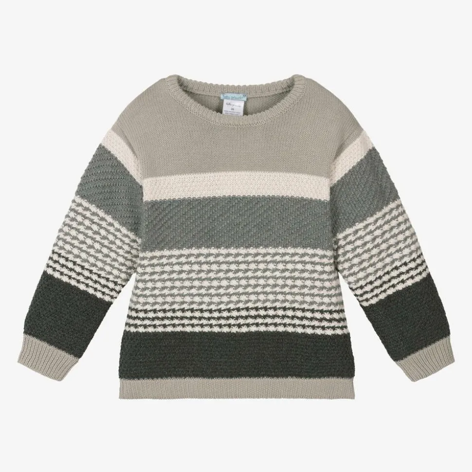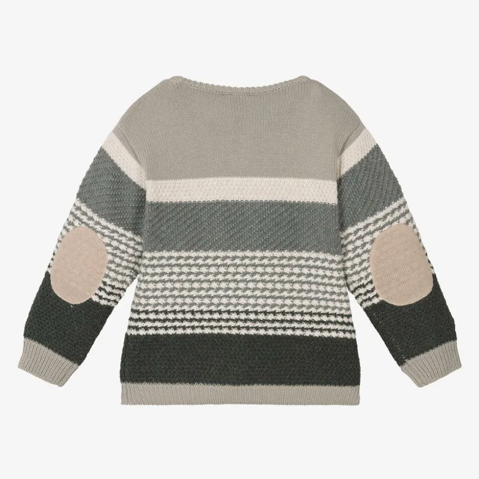 Stylish knitted jumper for boys by Tutto Piccolo, striped in shades of grey. Made in a soft cotton blend, it is knitted with varying patterns for a lovely textured finish. This classic long-sleeved style is complete with soft ribbed trims on the crew neck, cuffs and hem.