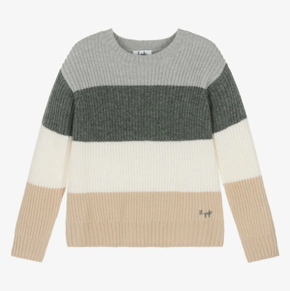 Cosy sweater for boys by Italian brand Il Gufo, in grey, ivory and beige colourblock stripes. This luxurious knitwear is beautifully crafted from Italian spun virgin wool yarn. It is subtly branded with a grey logo embroidery above the hem.